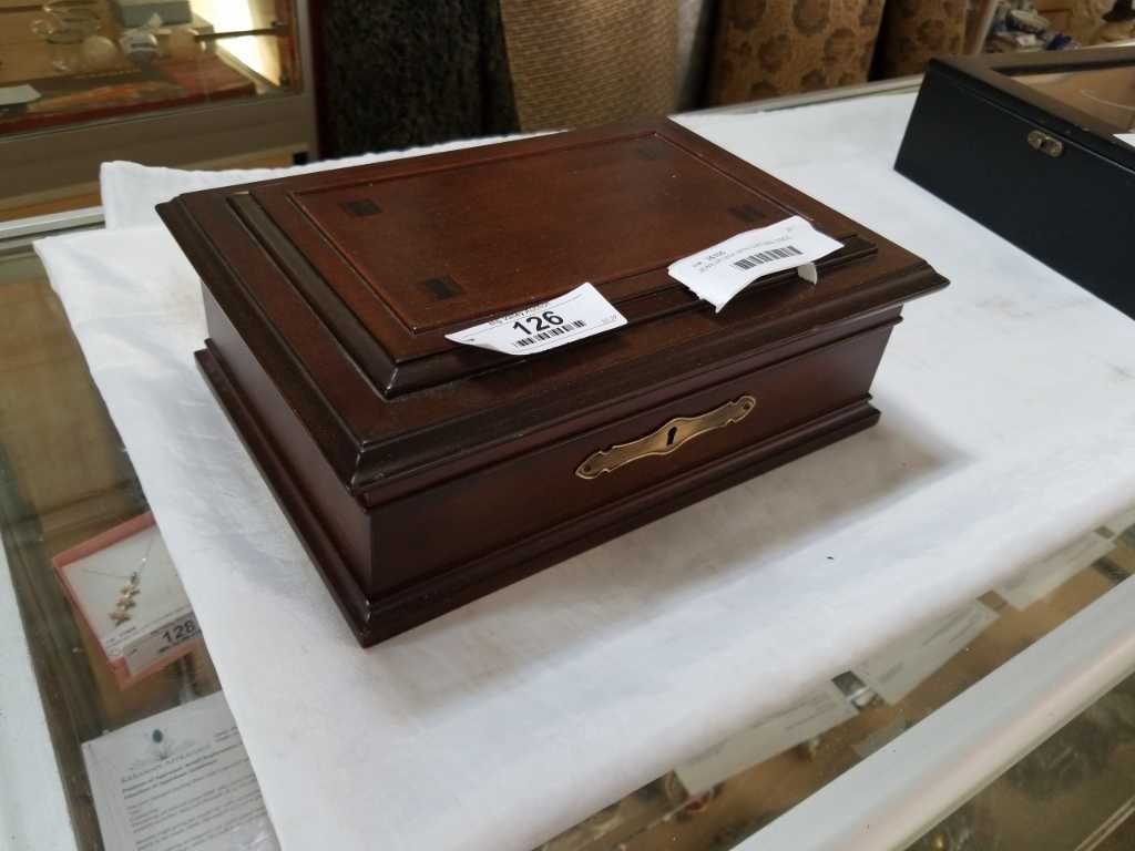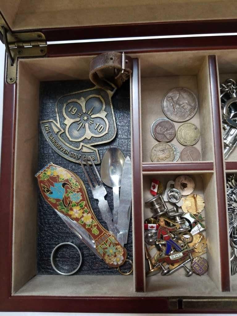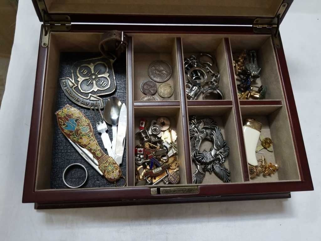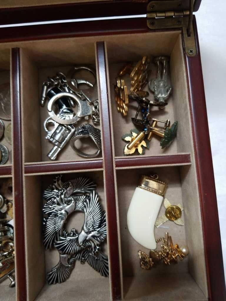 JEWELRY BOX WITH CUFFLINKS, RINGS, COLLECTABLES
