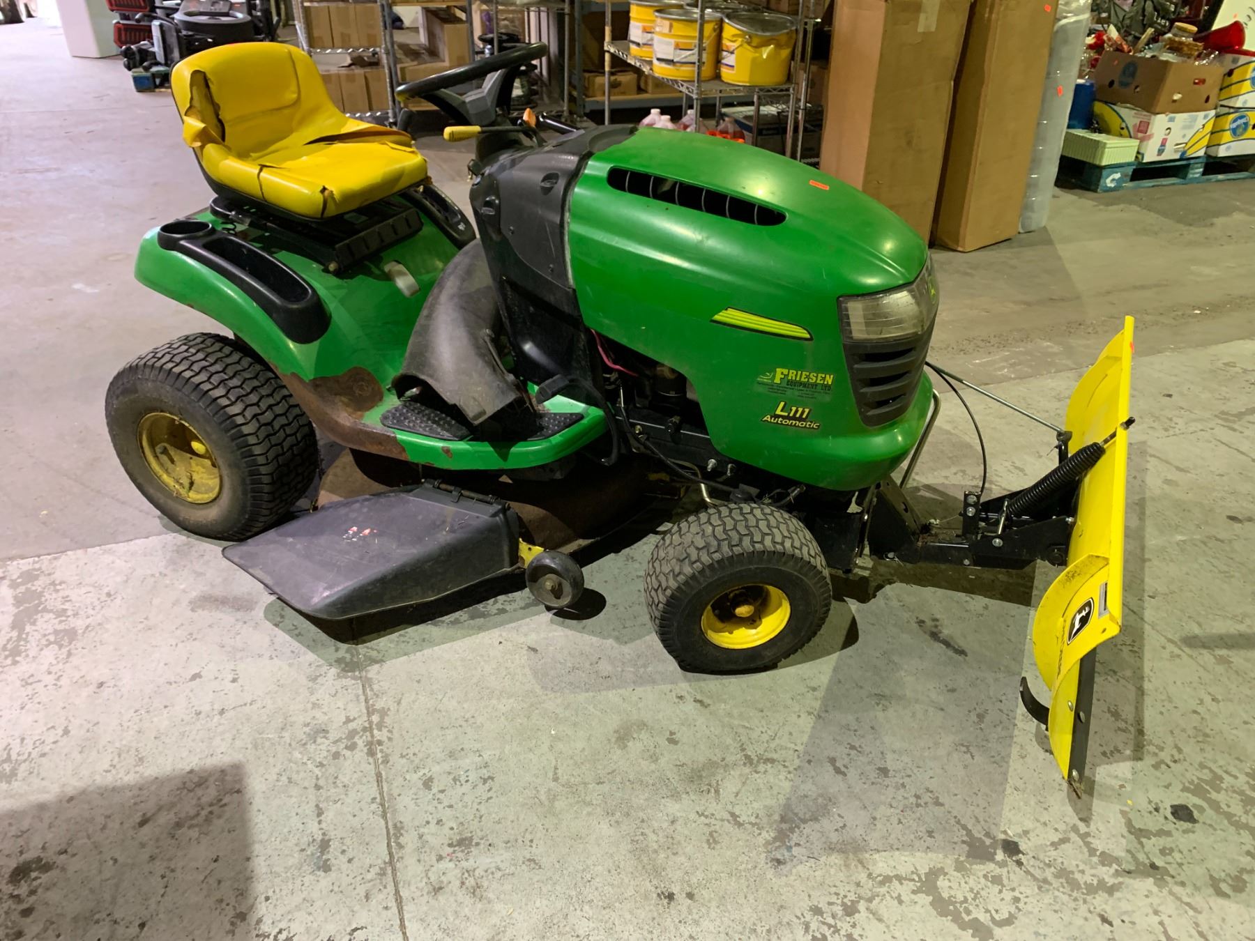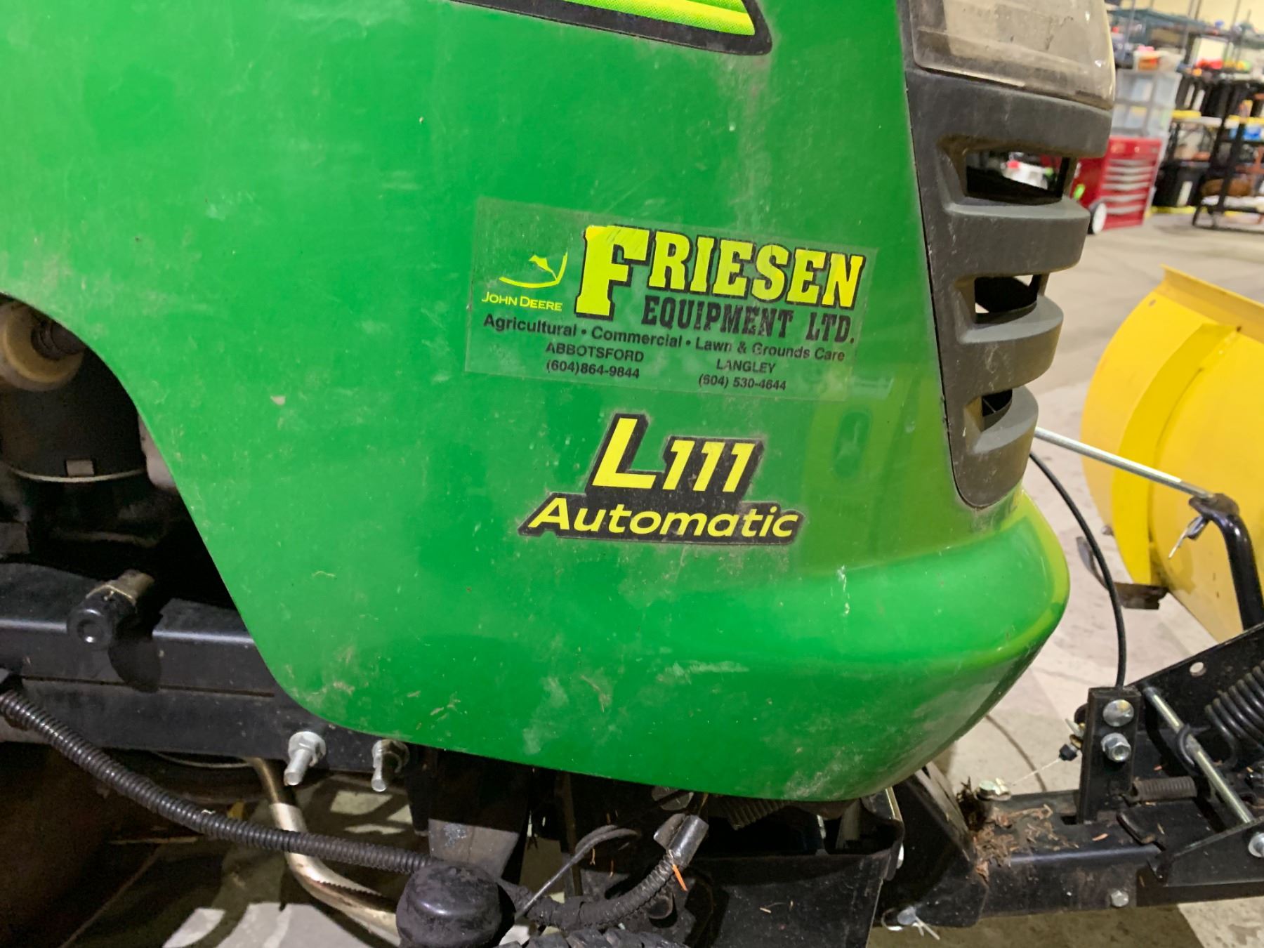 JOHN DEERE L111 AUTOMATIC RIDE ON GAS MOWER WITH BLADE ATTACHMENT (SOME SEAT DAMAGE) *RUNNING ORDER*