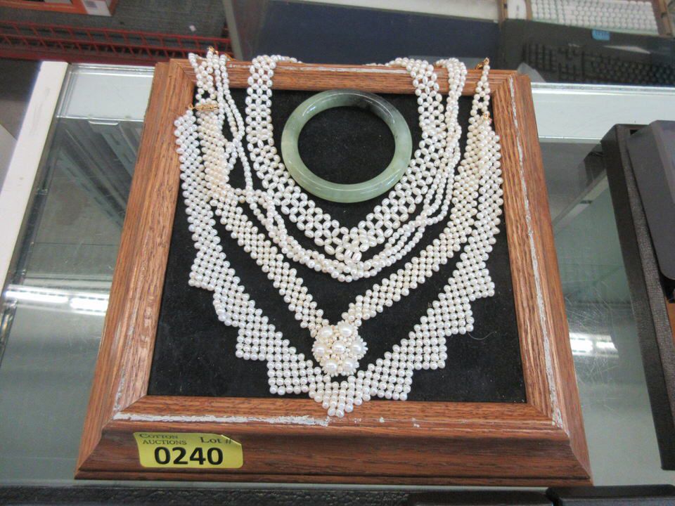 Necklaces are 18" long. Jade bangle is 11 mm thick.