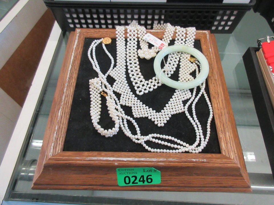Necklaces are 18" long. Jade bangle is 11 mm thick.