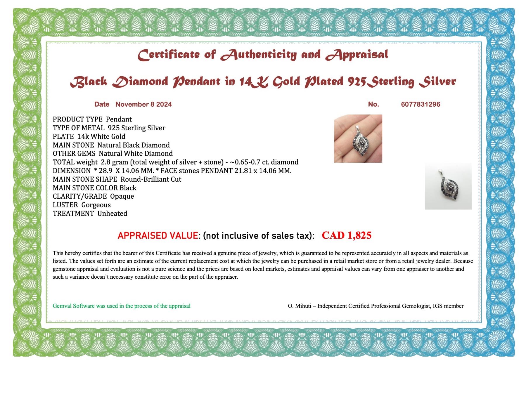 Jane SEYMOUR Collection 0.6 ct. NATURAL BACK AND WHITE DIAMONDS PENDANT in 14K White Gold plated 925 Sterling Silver – Appraised Replacement Value CAD 1,825