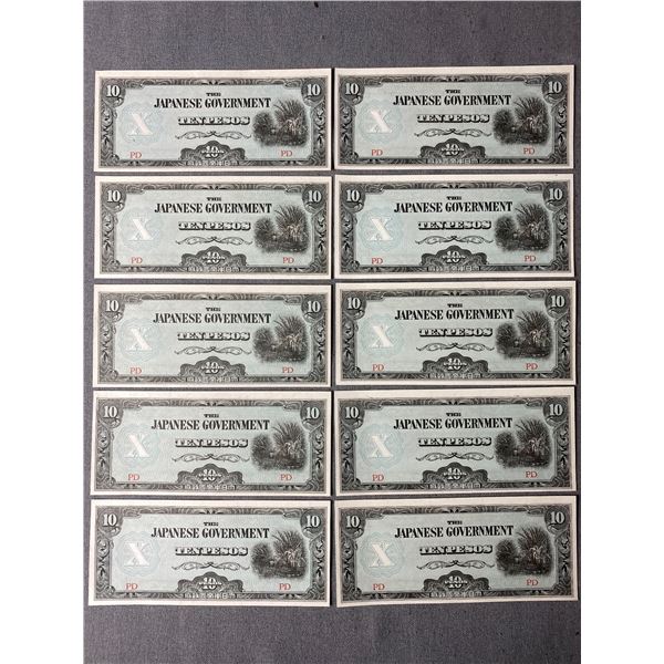 Lot of 10 Crisp Japanese Government 10 Peso Notes