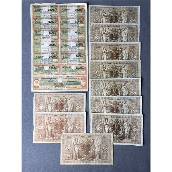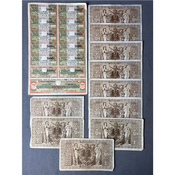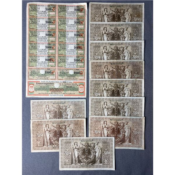 Germany 1922 War Bond Coupons With 10 German Banknotes