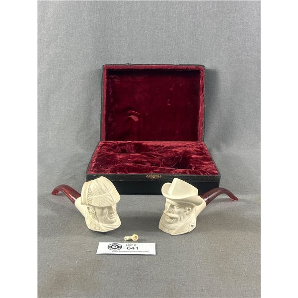 2 Carved Figural Pipes with Case. 1 Has Pipe Broken off