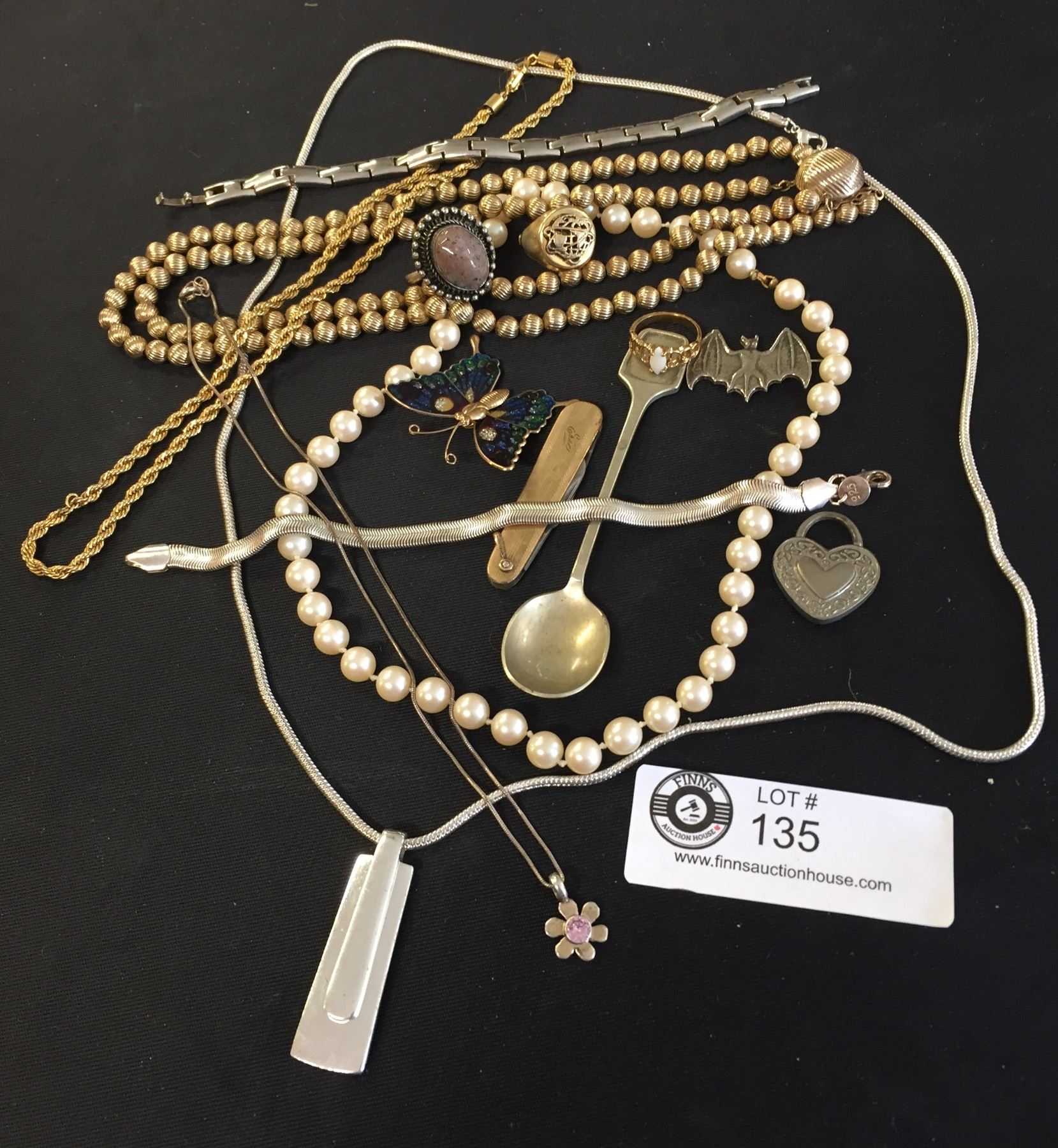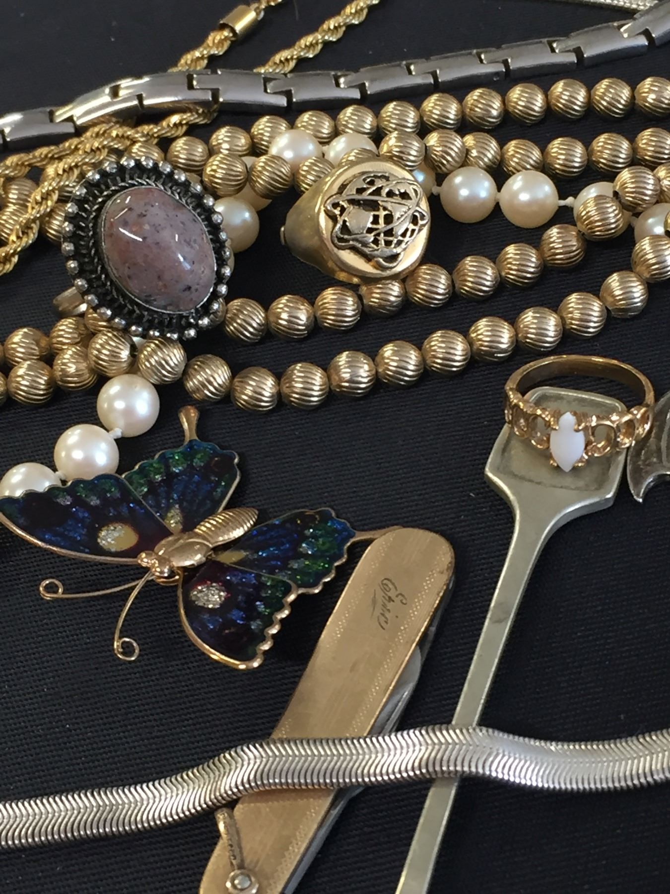 Jewelry Lot. Rings, necklaces poket knife, spoon, pins, bracelet