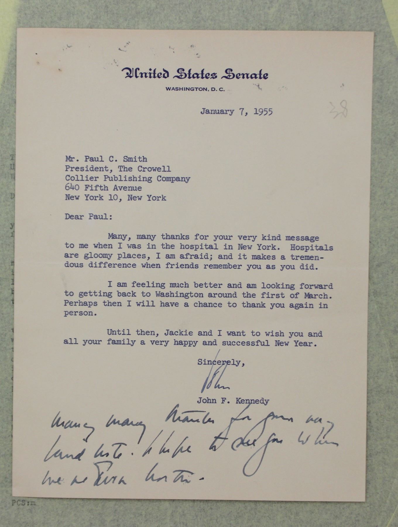 A letter addressed to Mr. Paul C. Smith, President of the Crowell-Collier Publishing Company. Kennedy thanks Mr. Smith for the kind message when he was in hospital in New York recovering from spinal surgery in December 1954.