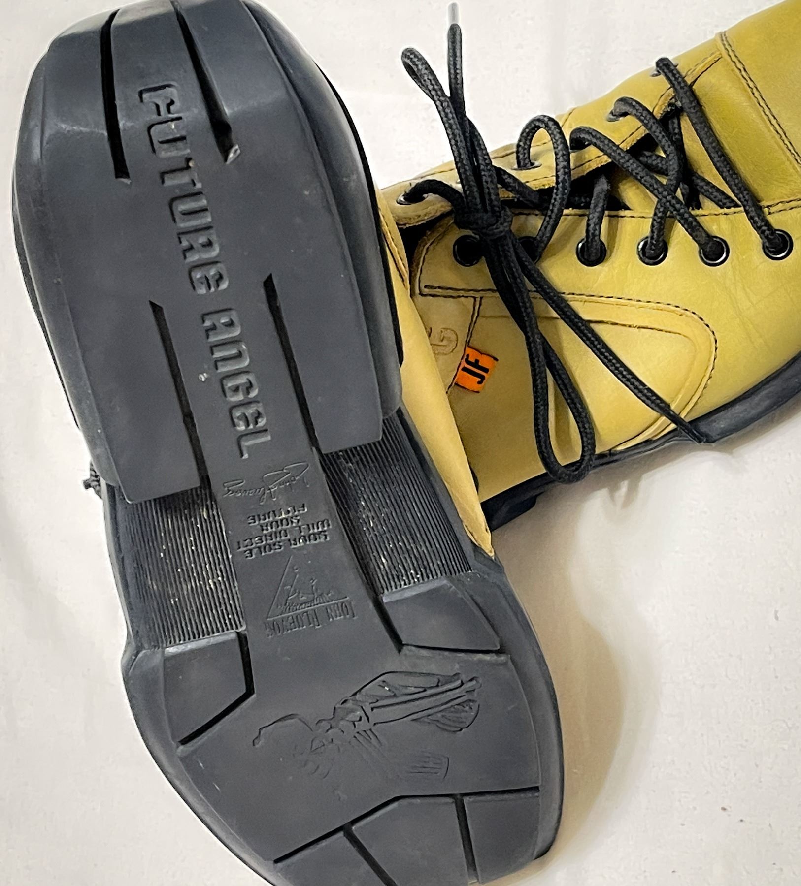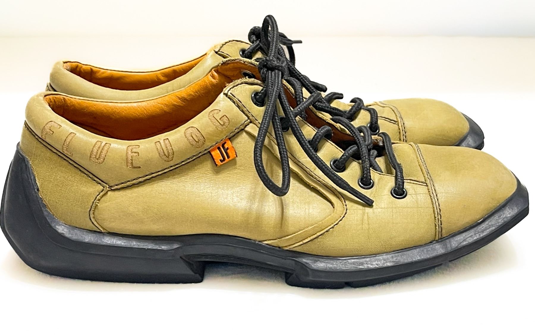 Classic John Fluevog leather lace-up shoes featuring the brand’s signature sculpted sole and bold styling. These unisex shoes are marked Men’s size 8 (Women’s 10) and showcase Fluevog’s distinctive craftsmanship and attention to detail, with embossed branding along the collar and the signature orange JF tag. The uppers are in good pre-owned condition with gentle wear consistent with light use, clean interiors, and solid soles.