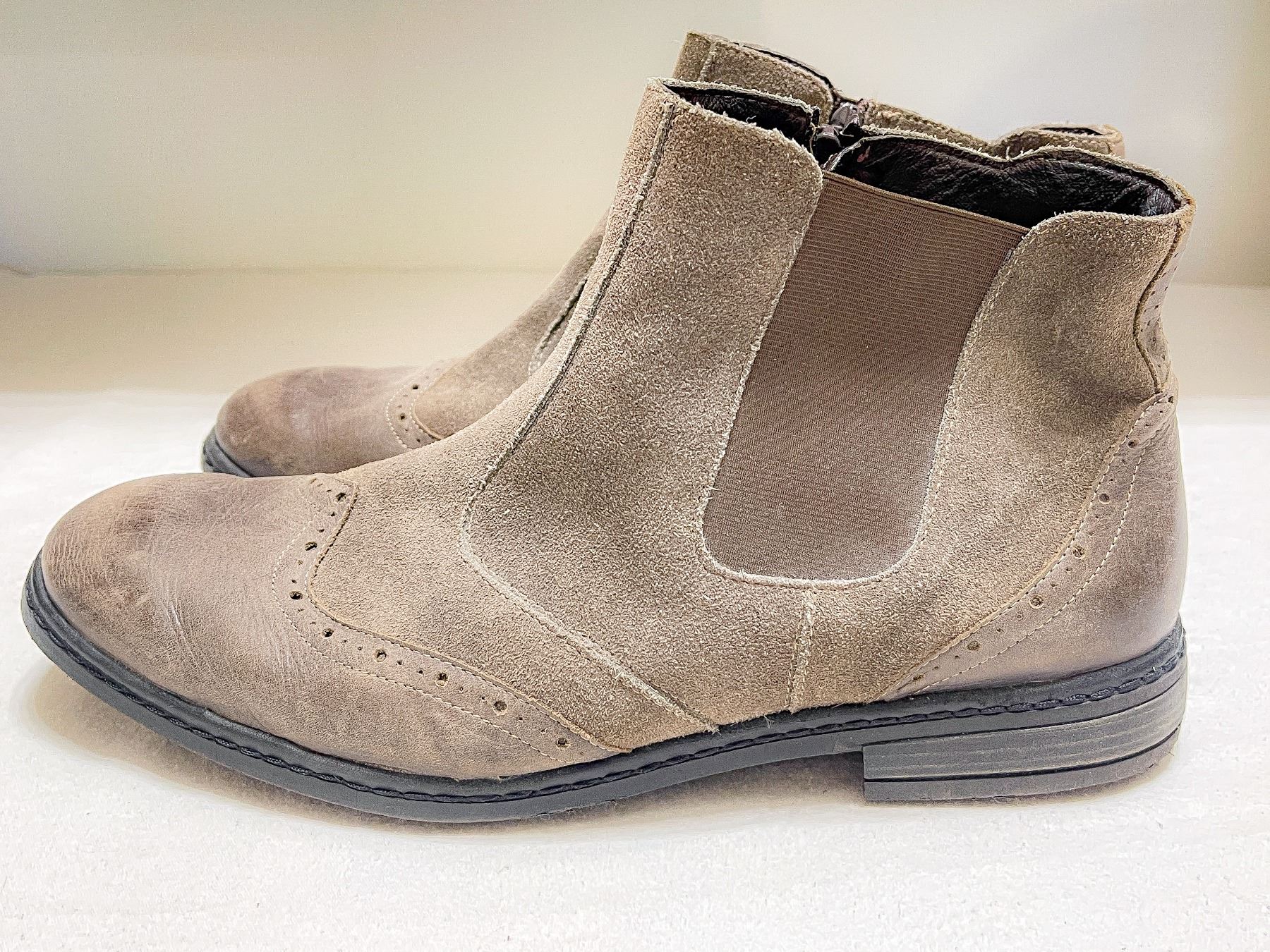 Comfortable and durable Josef Seibel men’s ankle boots crafted from soft taupe suede with brogue-style stitching and elastic side panels for an easy fit. These boots feature inner zippers, cushioned insoles, and flexible rubber soles designed for all-day wear. Marked size 45 in extra wide, they show light, natural wear and remain in good overall condition.