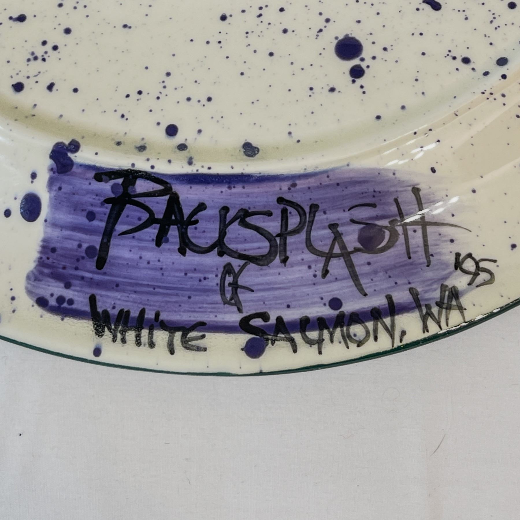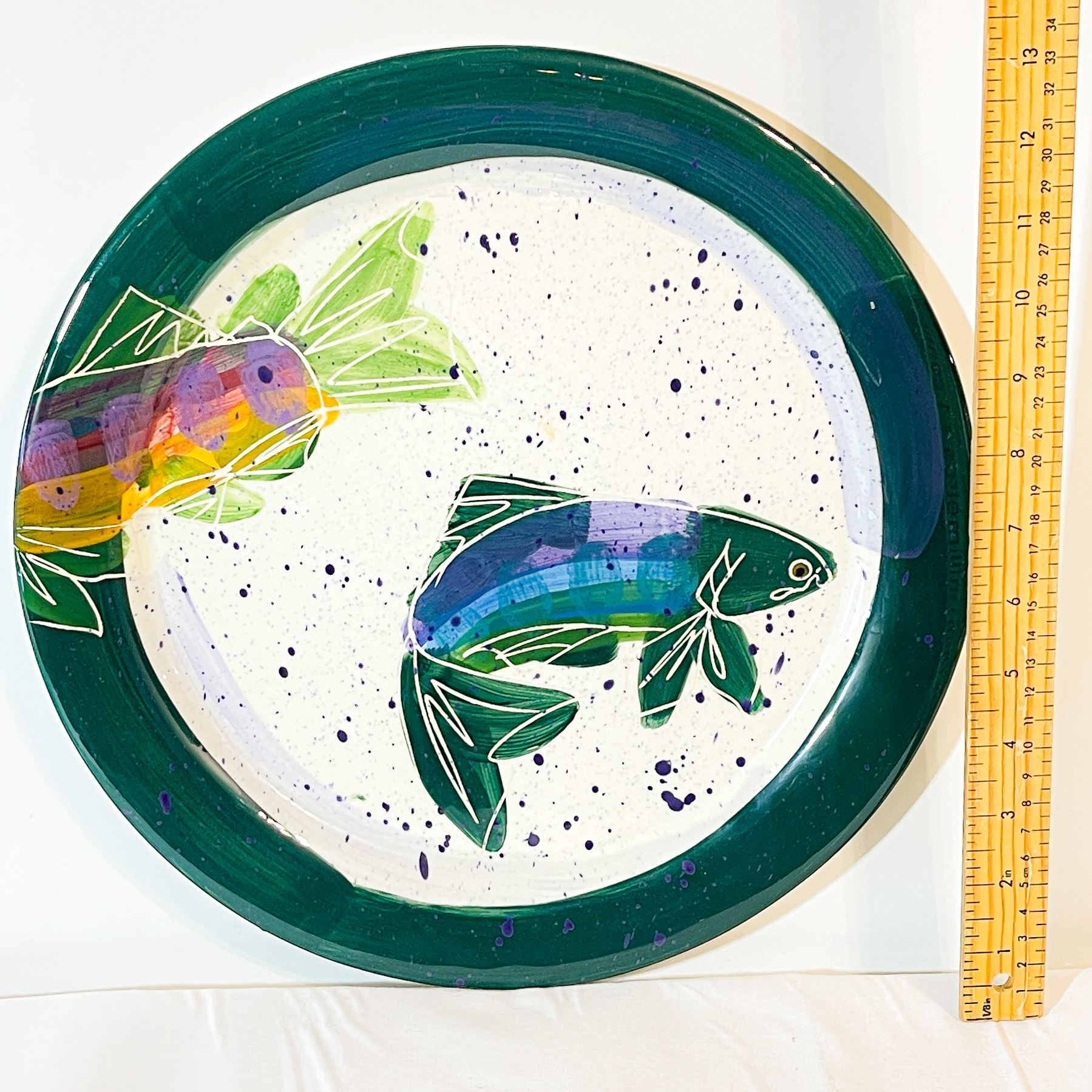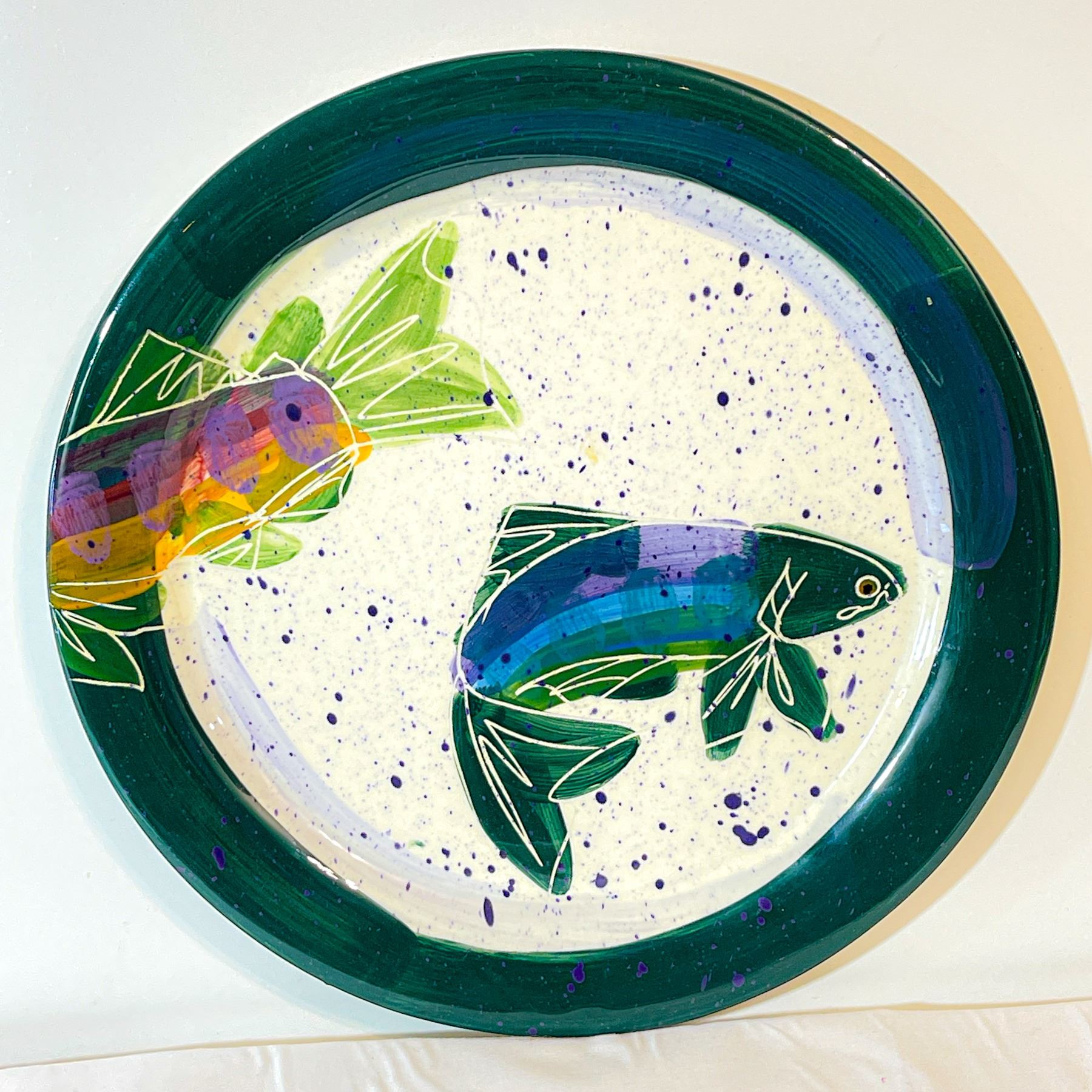 Large decorative ceramic platter by artist Julie Ueland, titled Backsplash of White Salmon. Features a bold, hand-painted design of two stylized fish in vibrant green, purple, and orange tones against a speckled white background with a deep green rim. Striking, contemporary aesthetic suitable for display or functional use. In excellent condition with no visible chips or cracks.
