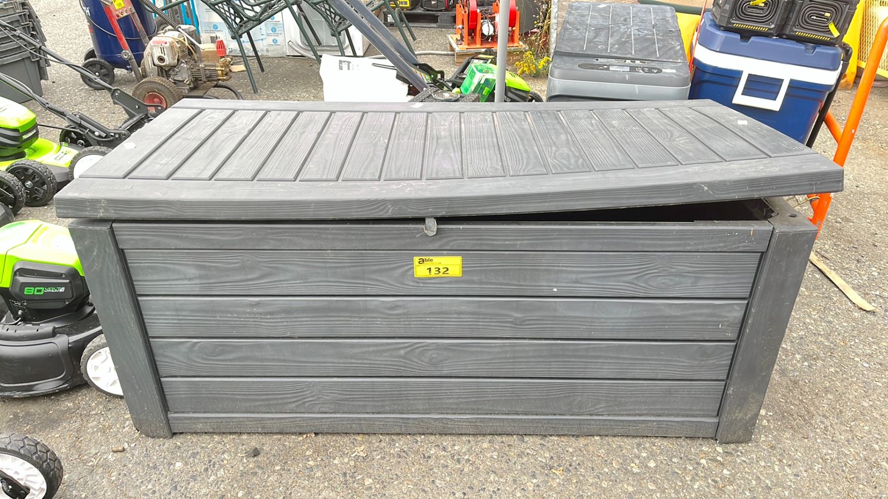 KETER BLACK 60 1/2"W X 28"D X 25 1/2"H LOCKABLE OUTDOOR PLASTIC STORAGE BIN *LID HAS DAMAGE/CONTENTS INCLUDED*