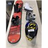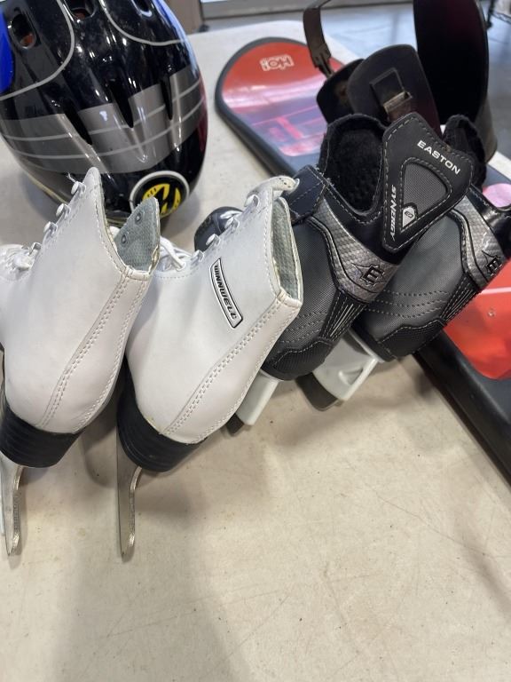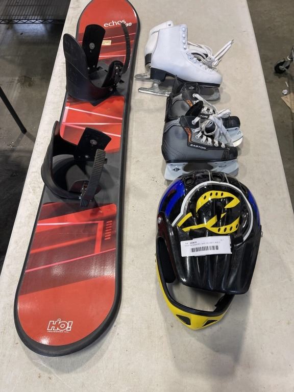 KIDS SNOWBAORD, BIKE HELMET, AND 2 PAIRS OF SKATES