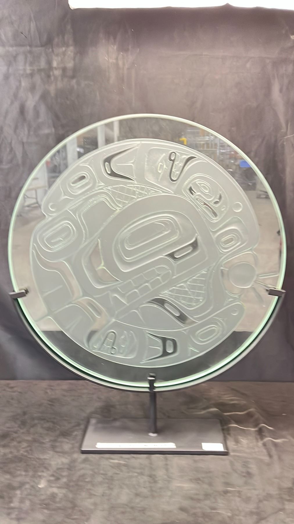 "KILLER WHALE (ORCA)" APPROX 20" PANEL IN GLASS ABOVE PAINTED METAL BASE BY HENRY REECE (TSIMSHIAN)