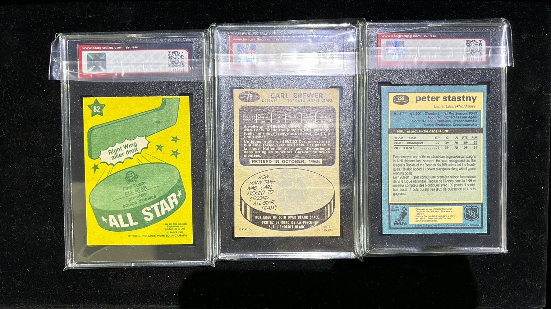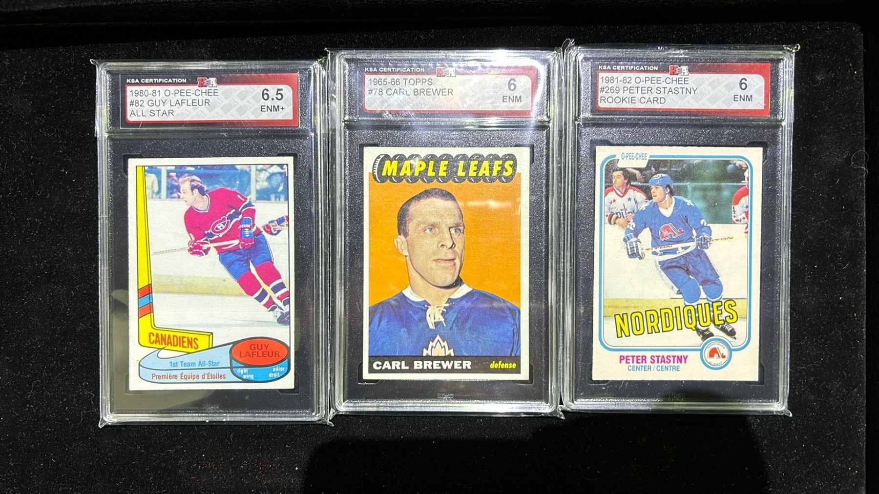 KSA 6 1981-82 OPC #269 PETER STASTNY ROOKIE, KSA 6 1965-66 TOPPS #78 CARL BREWER & KSA 6.5 1980-81 OPC #82 GUY LAFLEUR ALL STAR CARDS