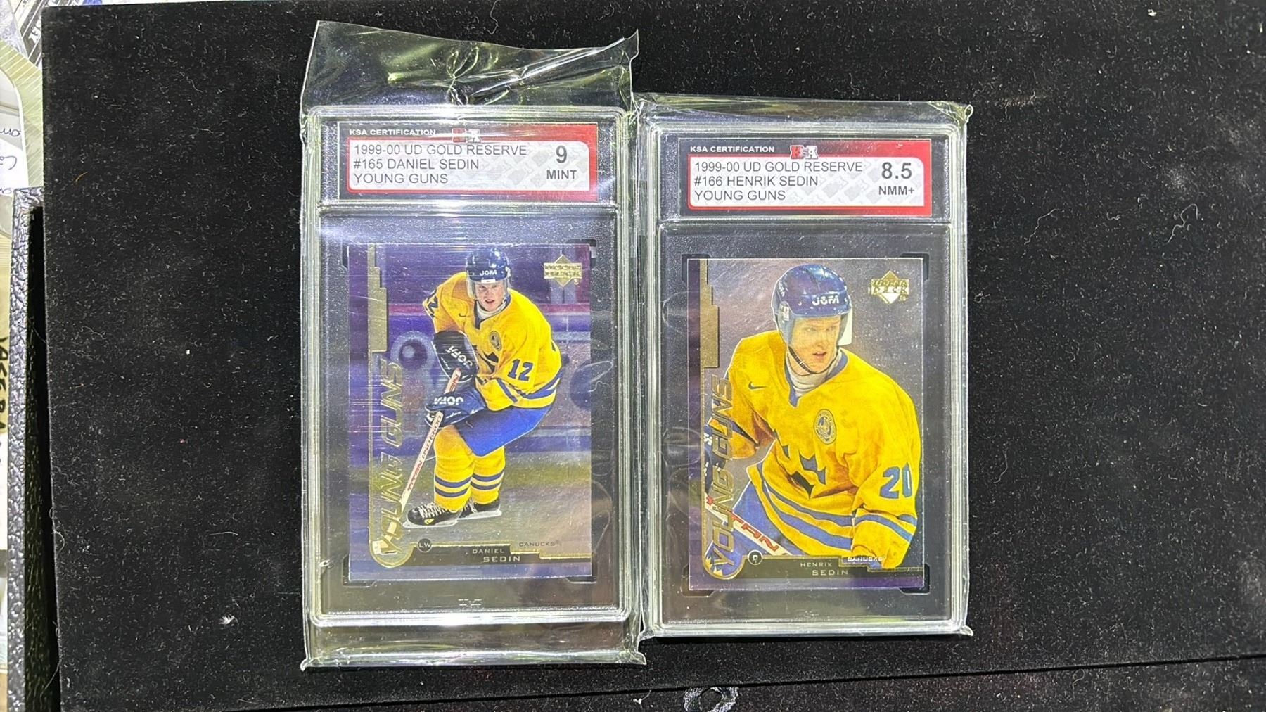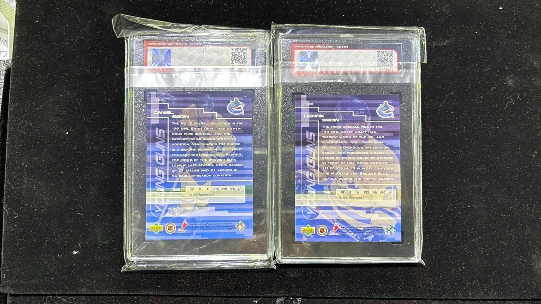 KSA 9 1999-00 UD GOLD RESERVE #165 DANIEL SEDIN YOUNG GUNS & KSA 8.5 1999-00 UD GOLD RESERVE #166 HENRIK SEDIN YOUNG GUNS CARDS