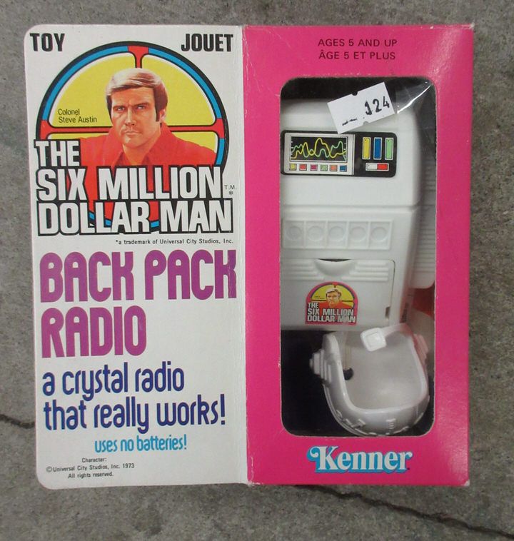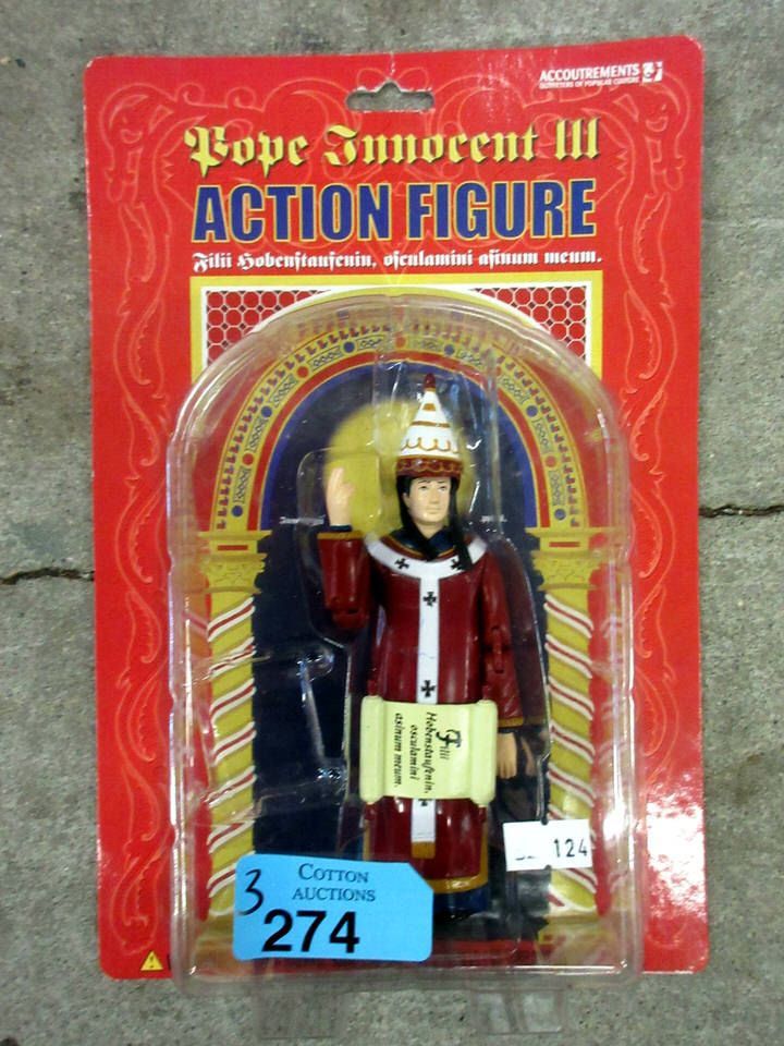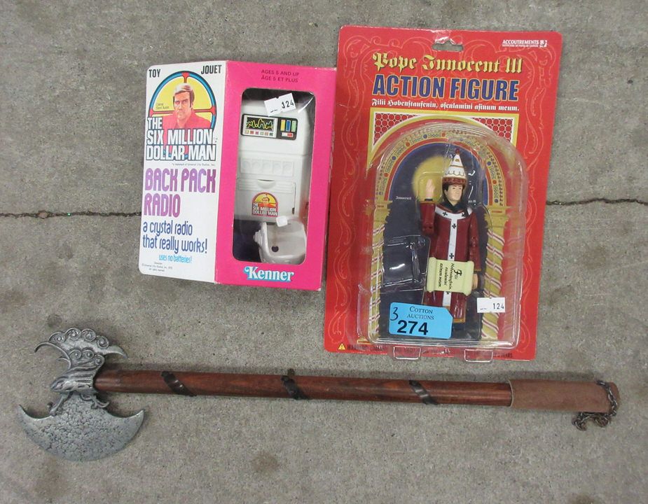1975 Kenner back pack radio, Pope Innocent III action figure & 20" Viking axe replica.