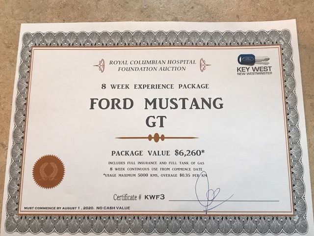 Key West Ford, 2 month lease on Ford Mustang GT, Value: $6,260 Spend 8 weeks driving in style. Vehicle comes with a full tank of gas and is fully insured. Must commence lease by August 1, 2020. Contact donna.macintosh2@fraserhealth.ca to coordinate pick-up/delivery of certificate (Key West Ford is located in New Westminster)
