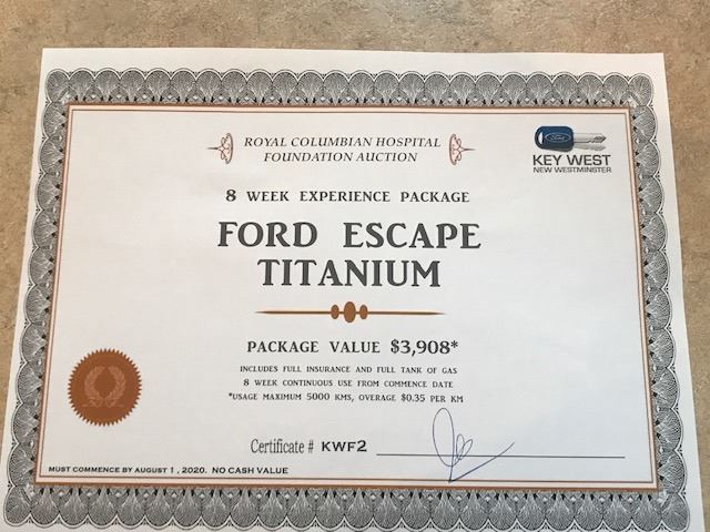 Key West Ford, 2 month lease on a Ford Escape Titanium, Value: $3,908 Spend 8 weeks driving in style. Vehicle comes with a full tank of gas and is fully insured. Must commence lease by August 1, 2020. Contact donna.macintosh2@fraserhealth.ca to coordinate pick-up/delivery of certificate (Key West Ford is located in New Westminster)
