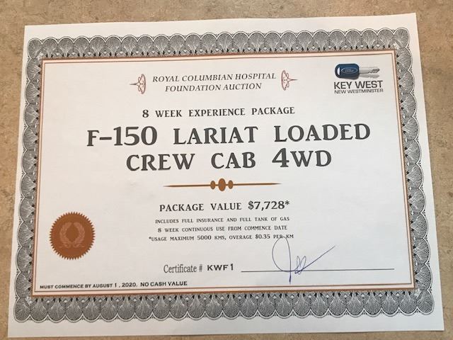 Key West Ford, 2 month lease on an F150 Lariat Loaded Crew Cab 4WD, Value: $7,728 Spend 8 weeks driving in style. Vehicle comes with a full tank of gas and is fully insured. Must commence lease by August 1, 2020. Contact donna.macintosh2@fraserhealth.ca to coordinate pick-up/delivery of certificate (Key West Ford is located in New Westminster)