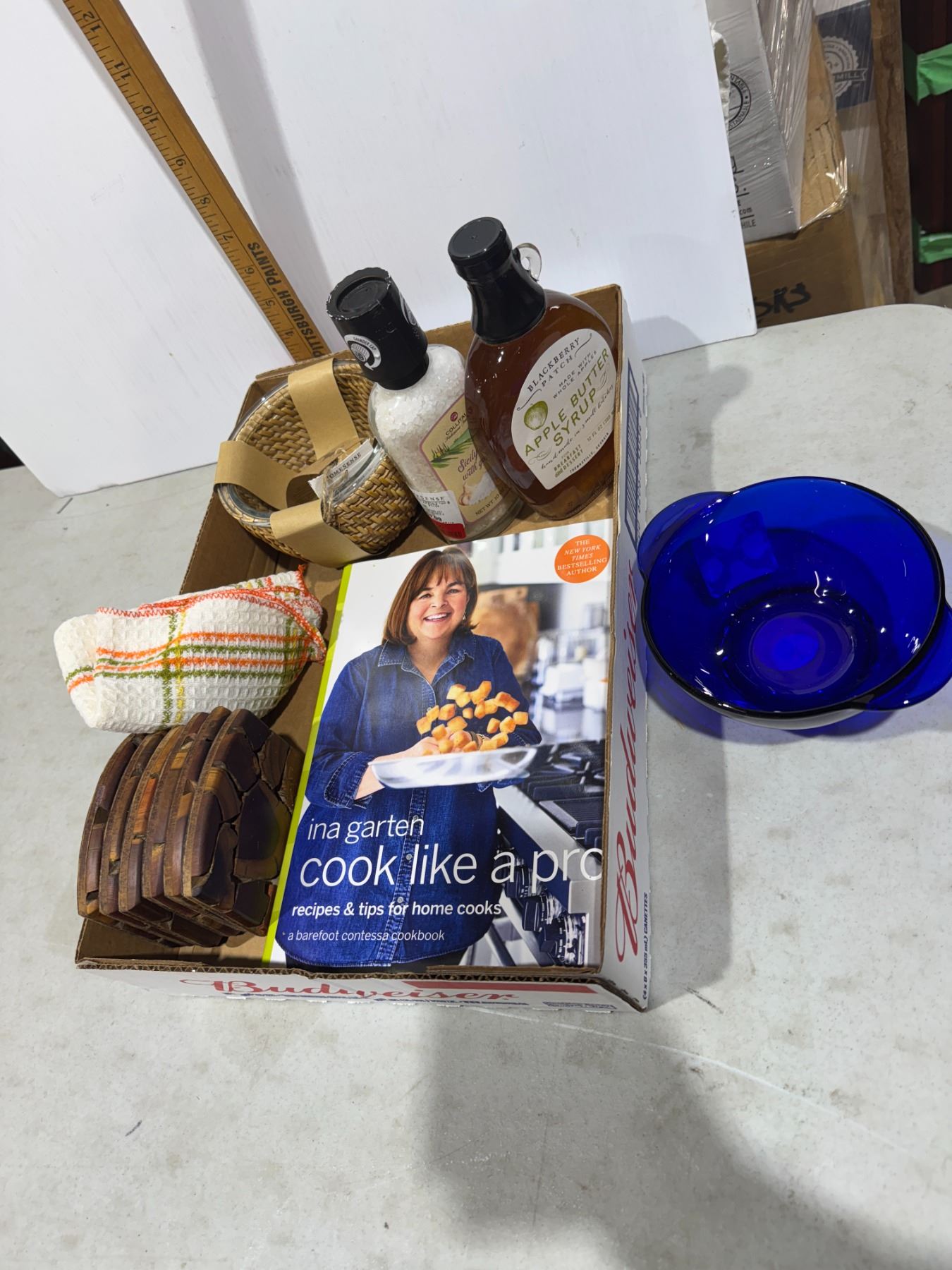 Kitchen items, apple butter, syrup, Sicily salt with garlic, cookbook, coasters bowls