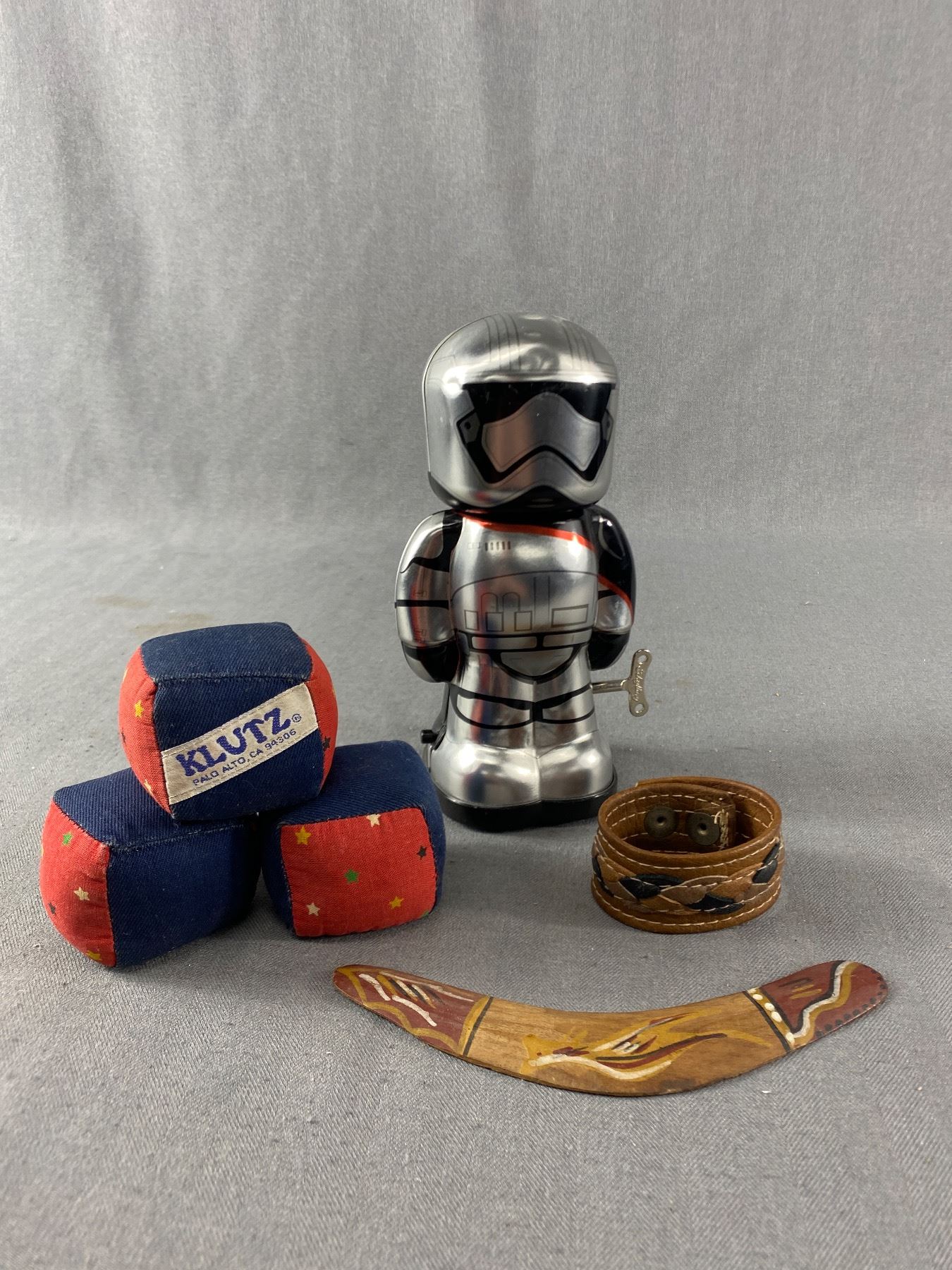 Klutz Juggling Bean Bag Cubes, Schylling Tin Wind-Up Storm Tropper, Leather Cuff & Mini Boomerang