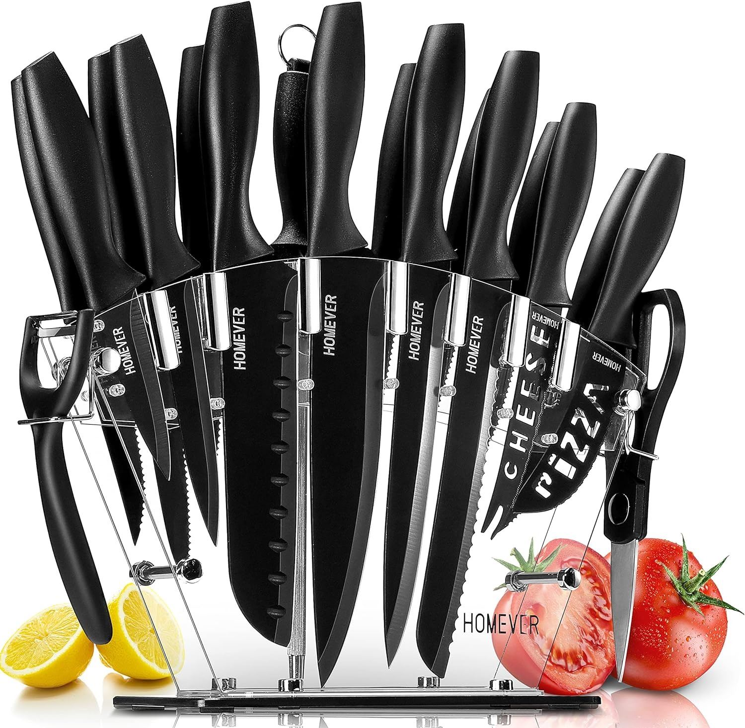 Knife Set, HOMEVER 19 Pieces Knife Block Set with Sharpener, Chef Knife, 6 Pieces Steak Knives, Utility Knife, Bread Knife, Stainless Steel, Black