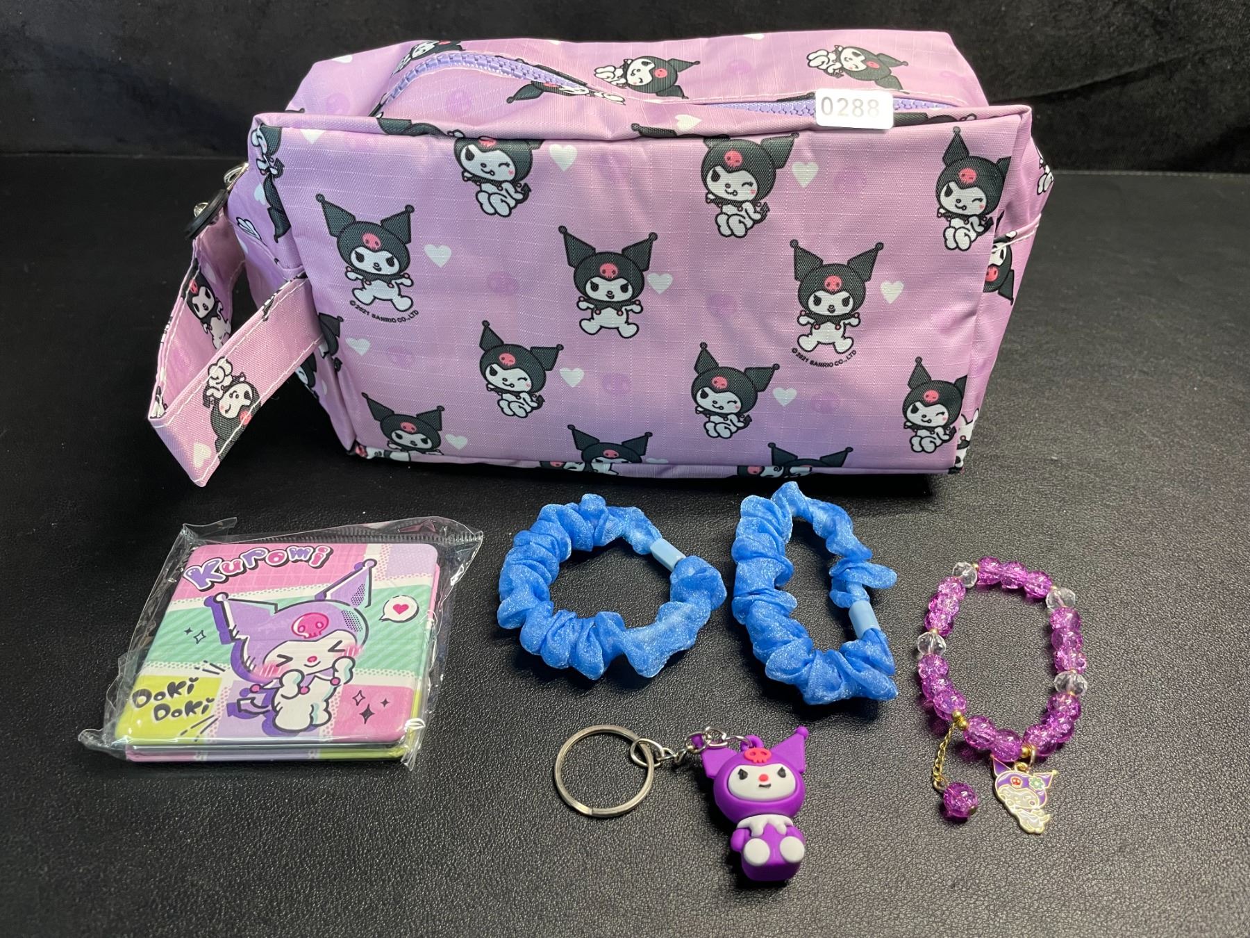 - 6PC kuromi cosmetic travel bag set with accessories (foldable mirror, 2 hair ties (color may vary from set to set), 1 bracelet, and 1 keychain)
