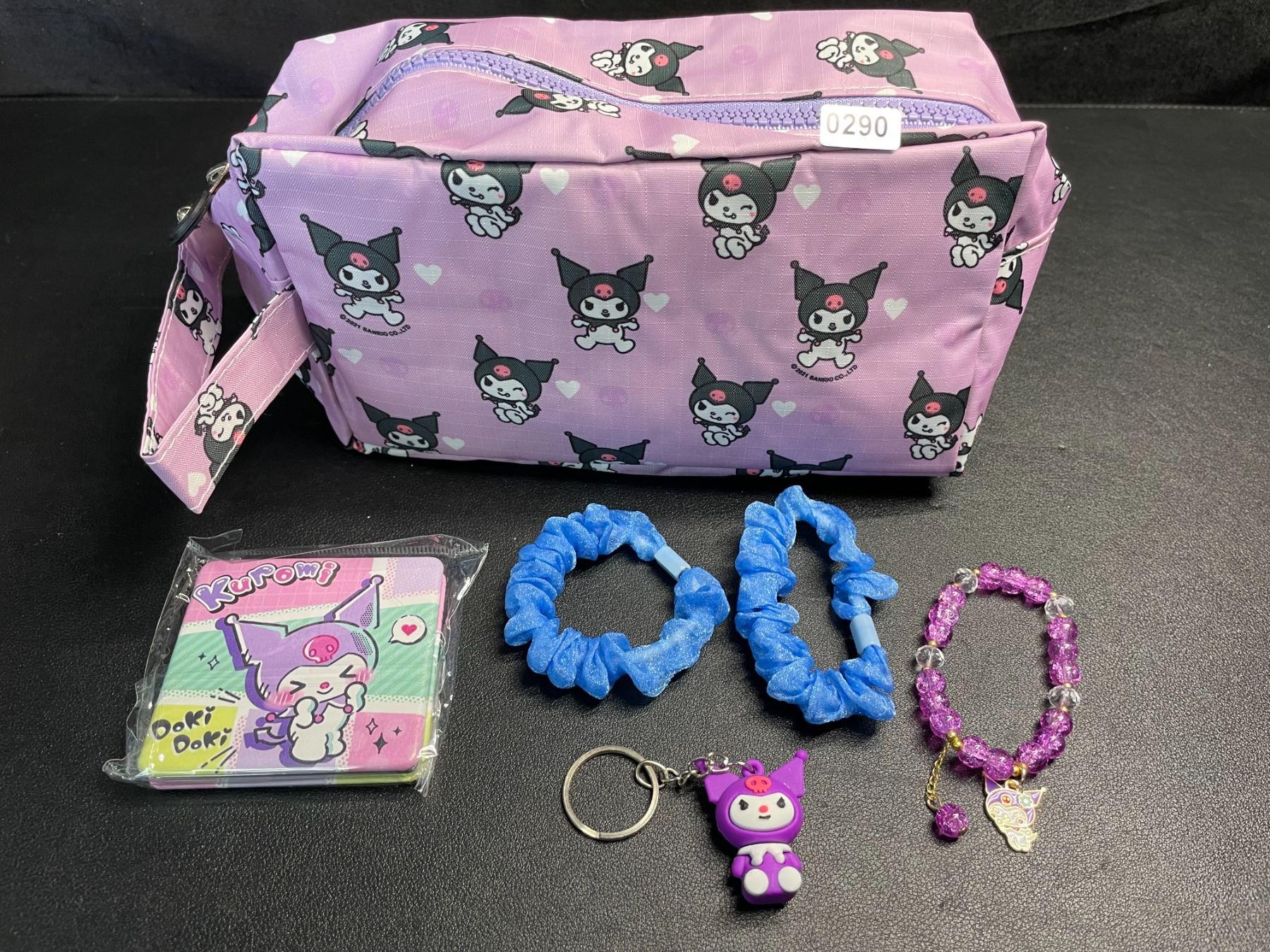 - 6PC kuromi cosmetic travel bag set with accessories (foldable mirror, 2 hair ties (color may vary from set to set), 1 bracelet, and 1 keychain)