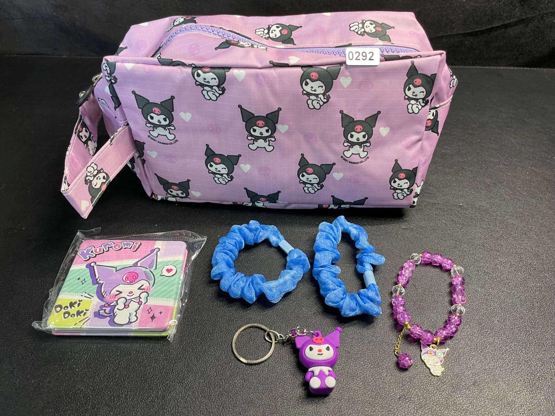 - 6PC kuromi cosmetic travel bag set with accessories (foldable mirror, 2 hair ties (color may vary from set to set), 1 bracelet, and 1 keychain)