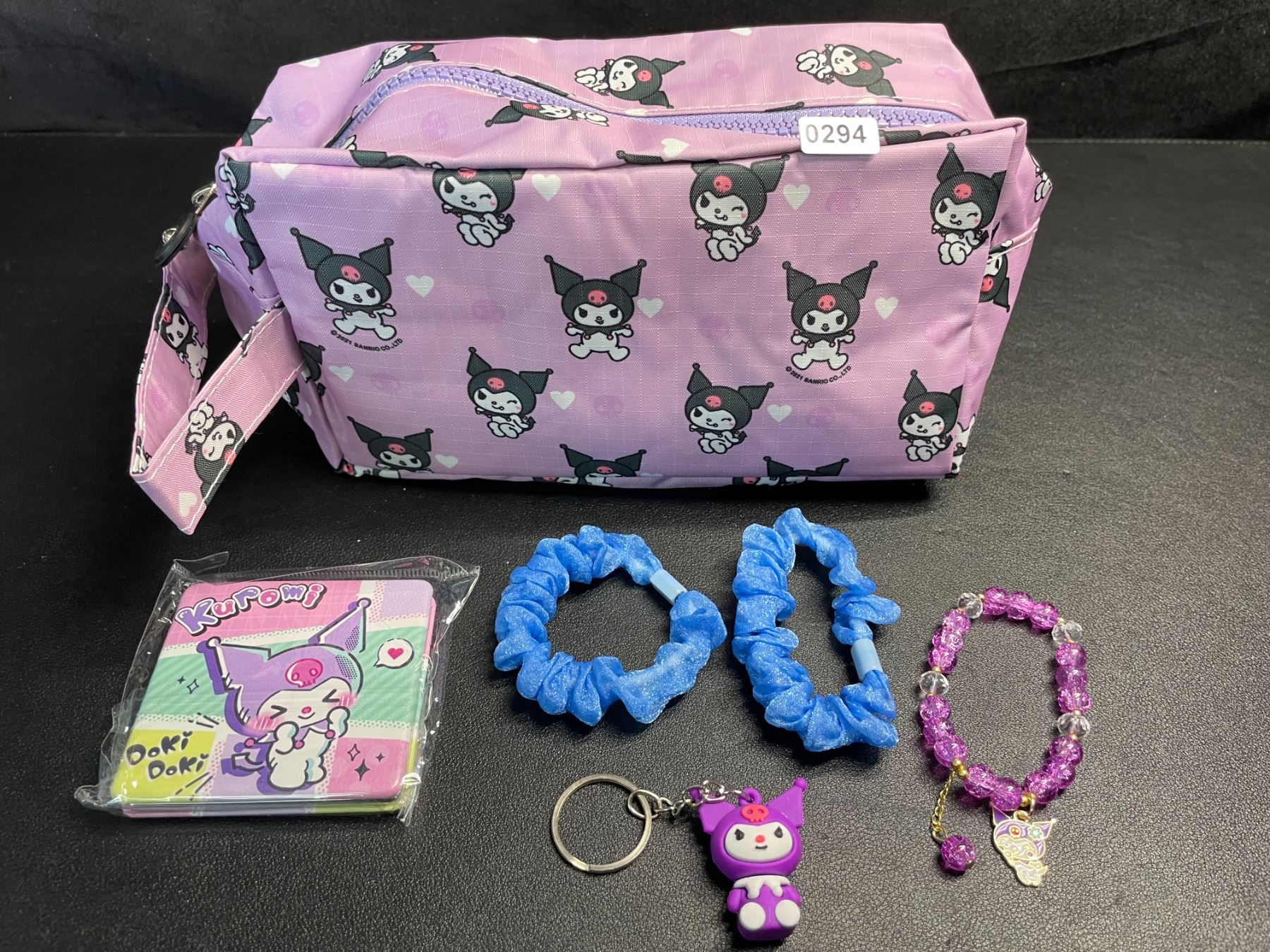 - 6PC kuromi cosmetic travel bag set with accessories (foldable mirror, 2 hair ties (color may vary from set to set), 1 bracelet, and 1 keychain)