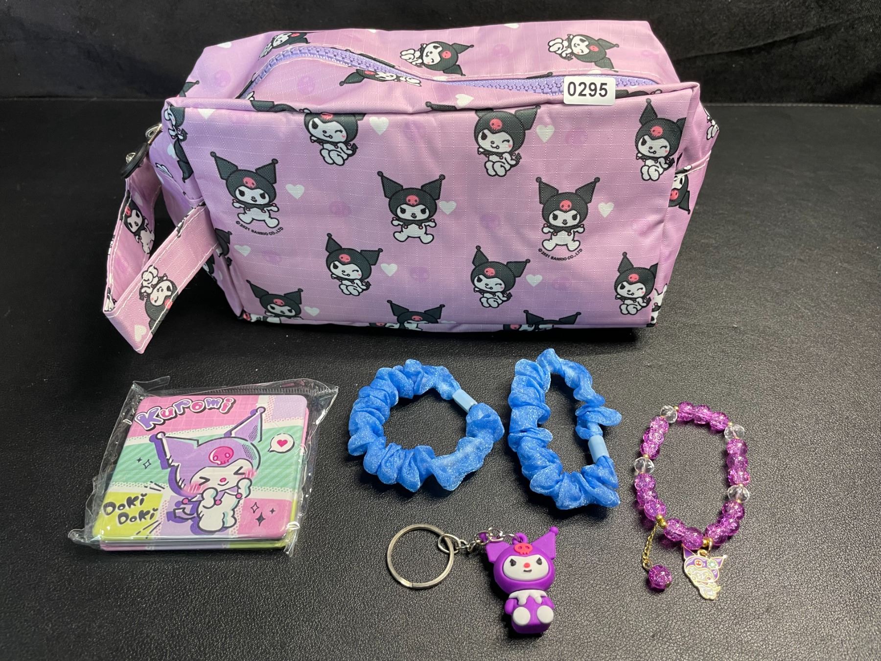 - 6PC kuromi cosmetic travel bag set with accessories (foldable mirror, 2 hair ties (color may vary from set to set), 1 bracelet, and 1 keychain)