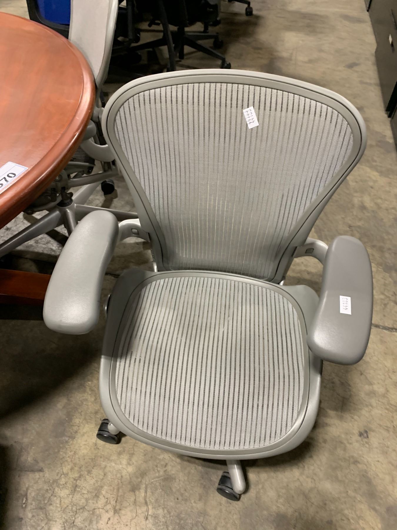 *L* GREY HERMAN MILLER AERON ERGONOMIC TASK CHAIR SIZE SMALL - NO LUMBAR SUPPORT ( BLACK MARKER ON RIGHT ARM ) *LOCATED IN LANGLEY 19757 92A AVE. REMOVAL ONLY THURS SEPT 7 & FRI SEPT 8 9AM - 4:30PM*