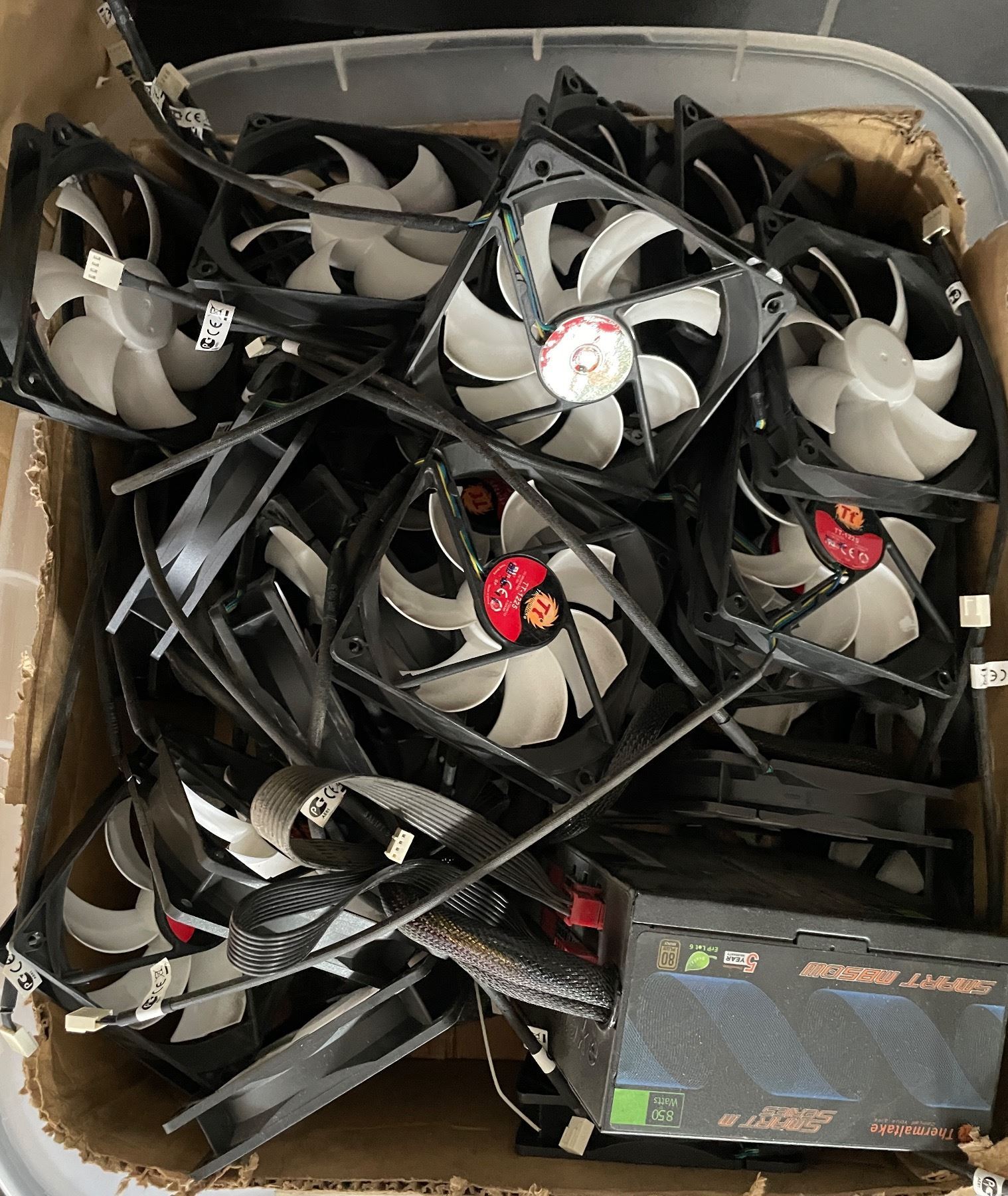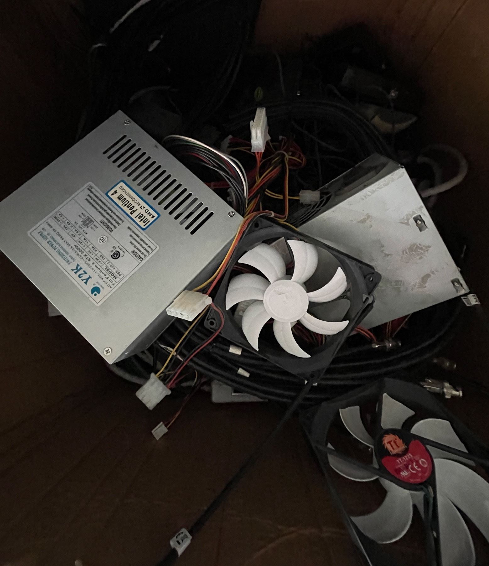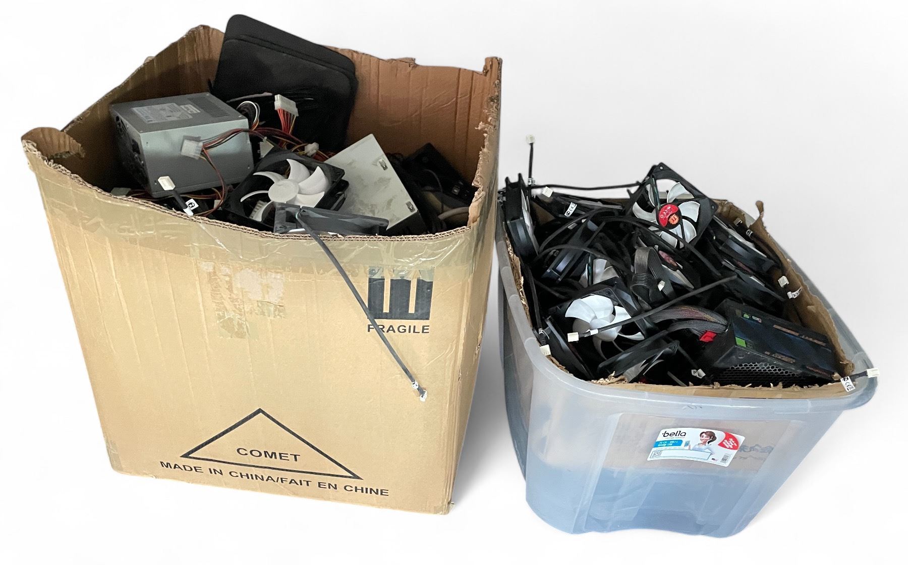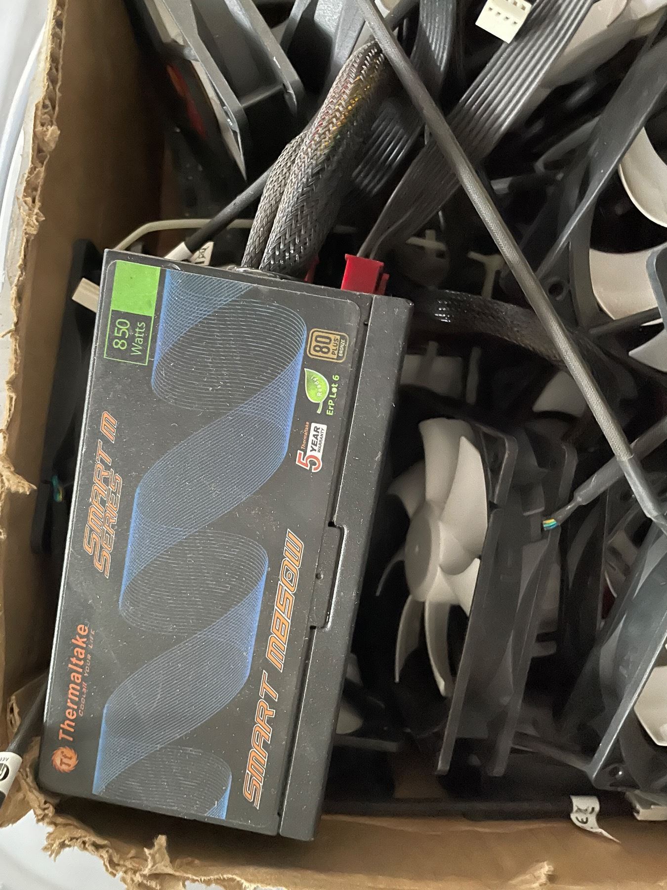 L1 - 2 Boxes of Misc Mining/Computer Parts - TT-11225 Thermaltake, Y2K Switching Power Supply, Thermaltake Smart M85OW Power Supply Unit, Cables, Inline Duct Fans, Etc.