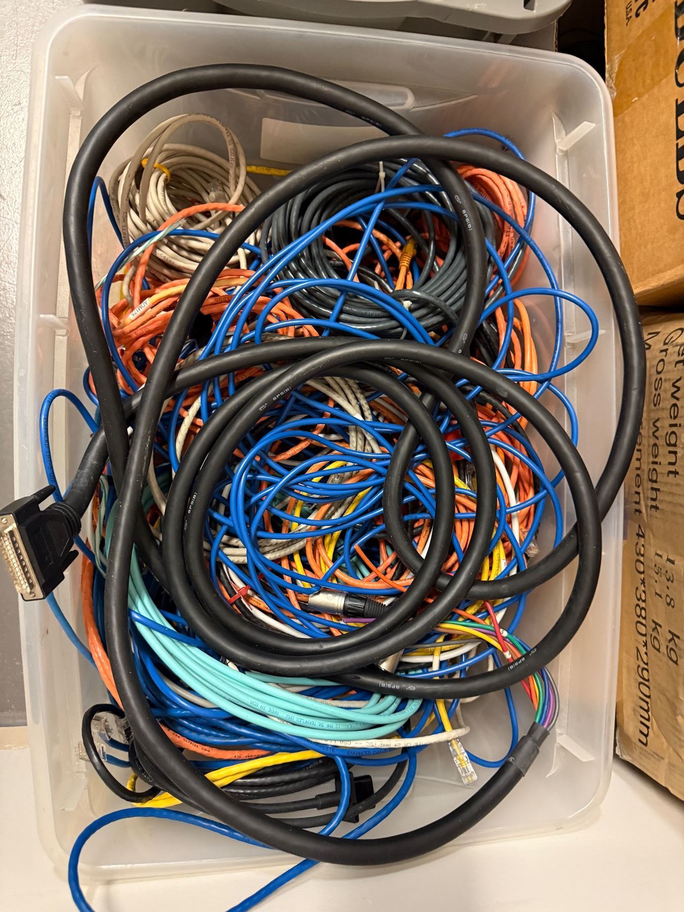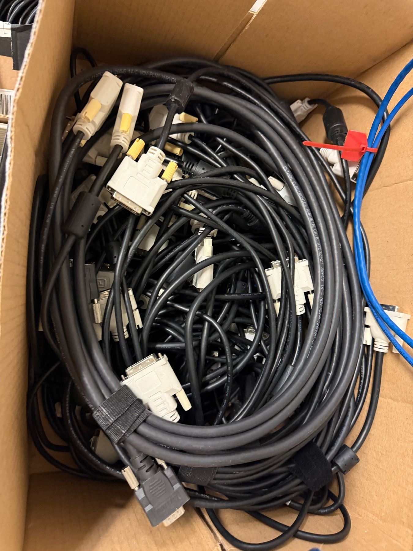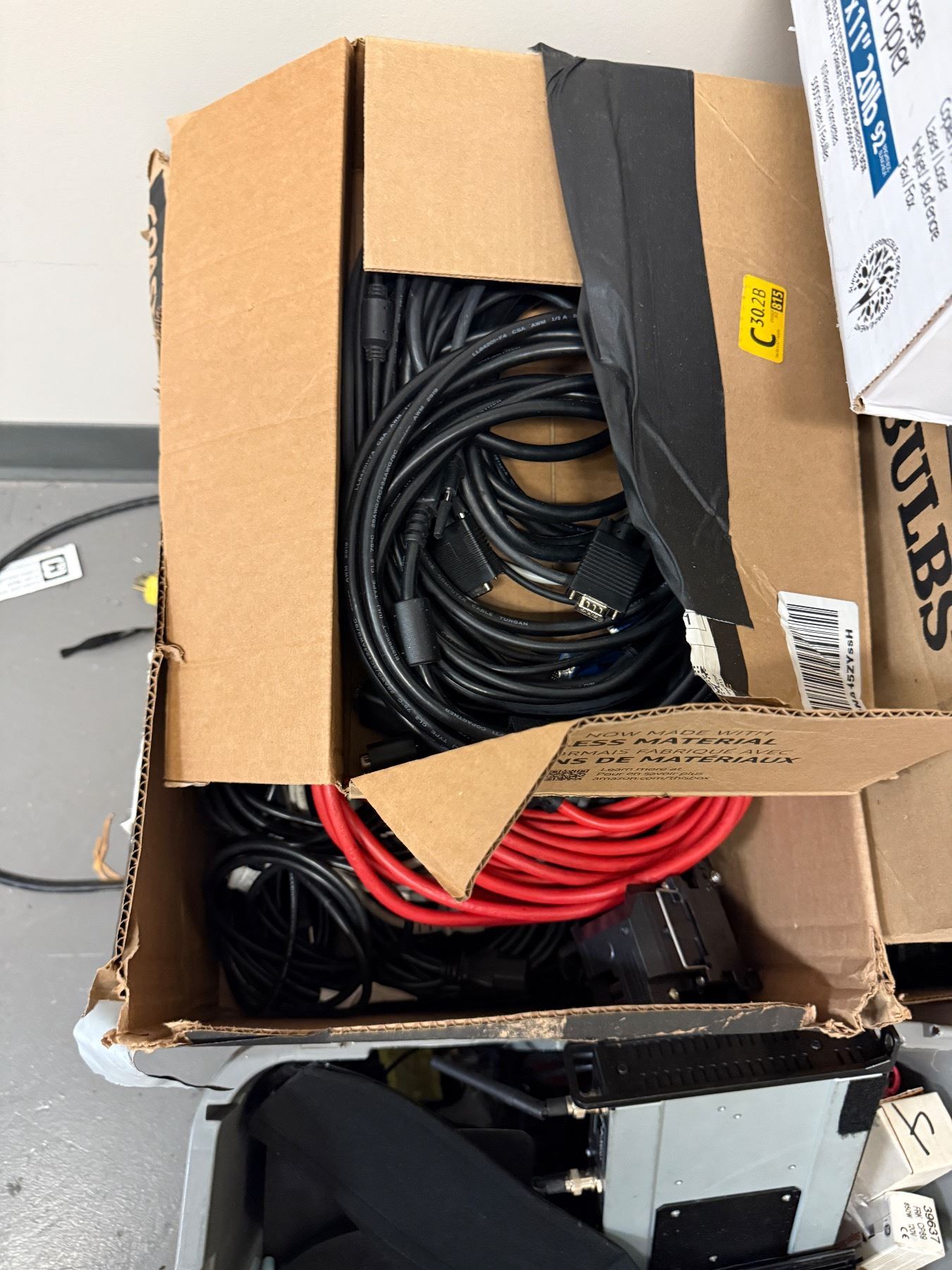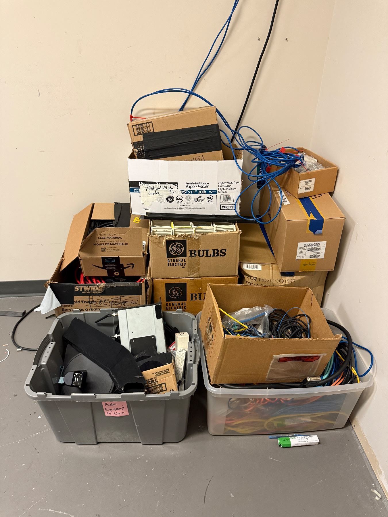 L1- Audio office - Bunch of cables including bulbs, VGA, DVI, Power cables, Laptop chargers and LAN cables
