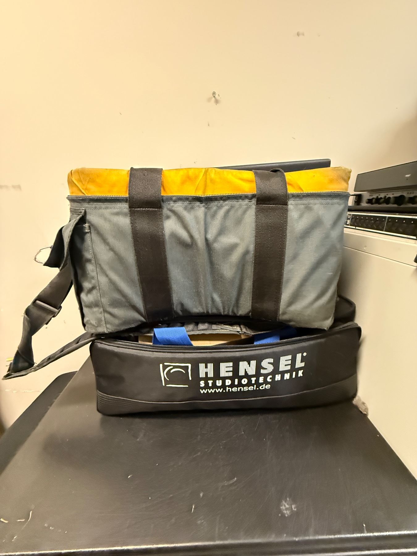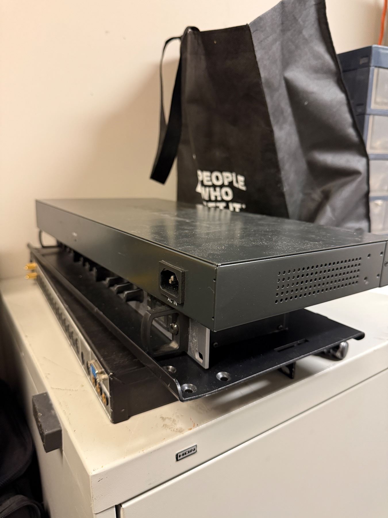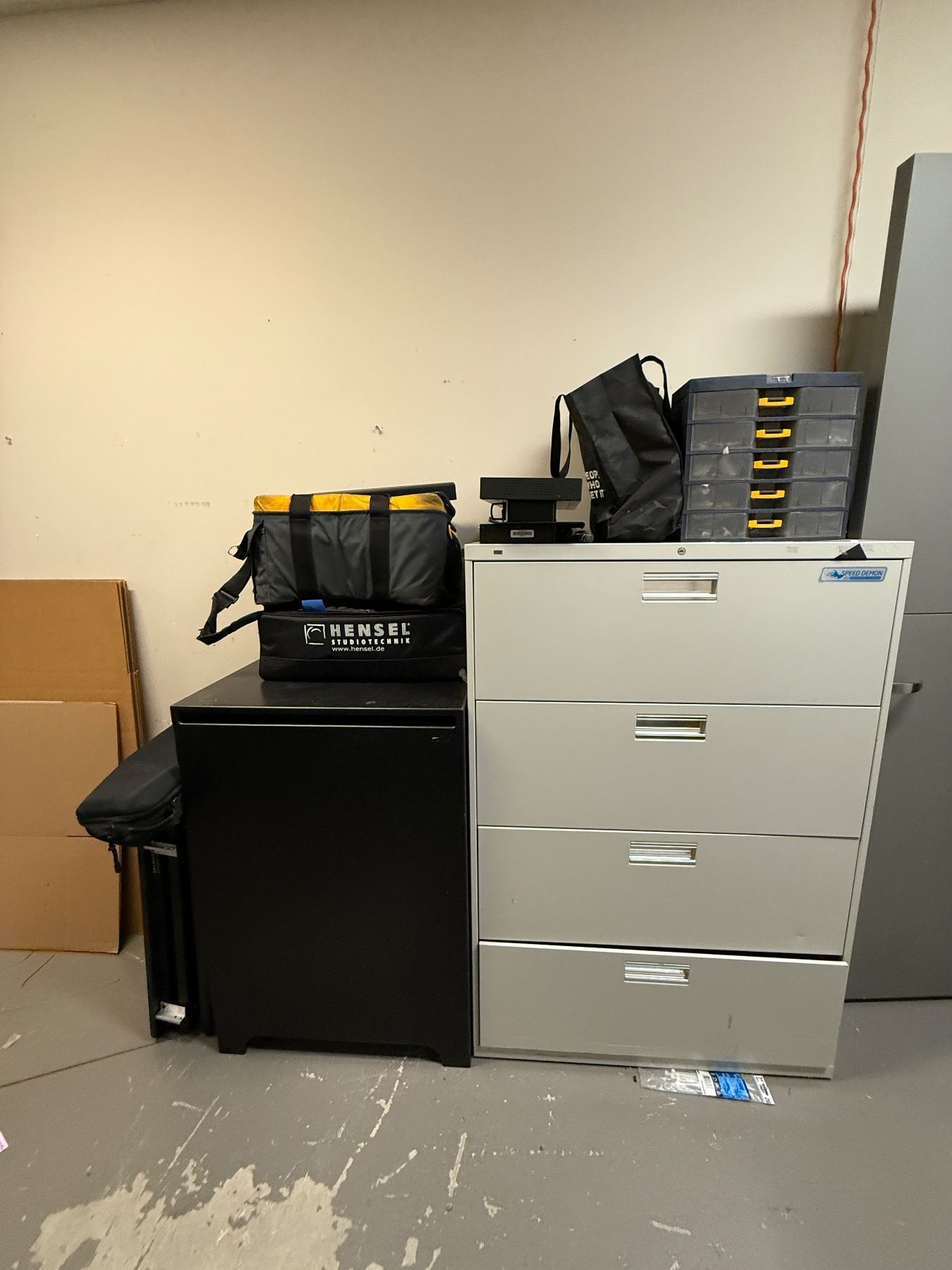 L1- Audio office - Group of misc stuff including steel cabinet, wooden box, Multi drawer organizer filled, 3 bags, hallogen bulbs , network switch and serial routing stereo input