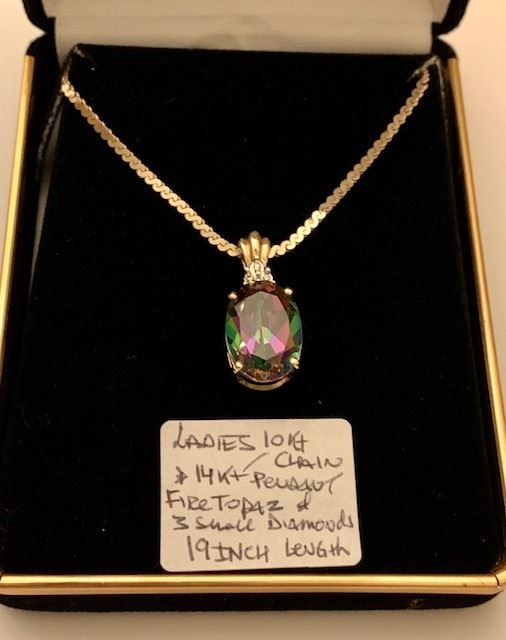 LADIES 10KT 19' CHAIN & 14KT PENDANT FIRE TOPAZ W/3 SM. DIAMONDS