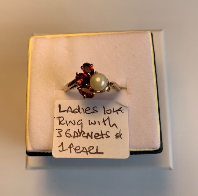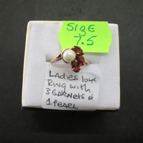 LADIES 10KT RING W/3 GARNETS & 1 PEARL - SZ - 7.5