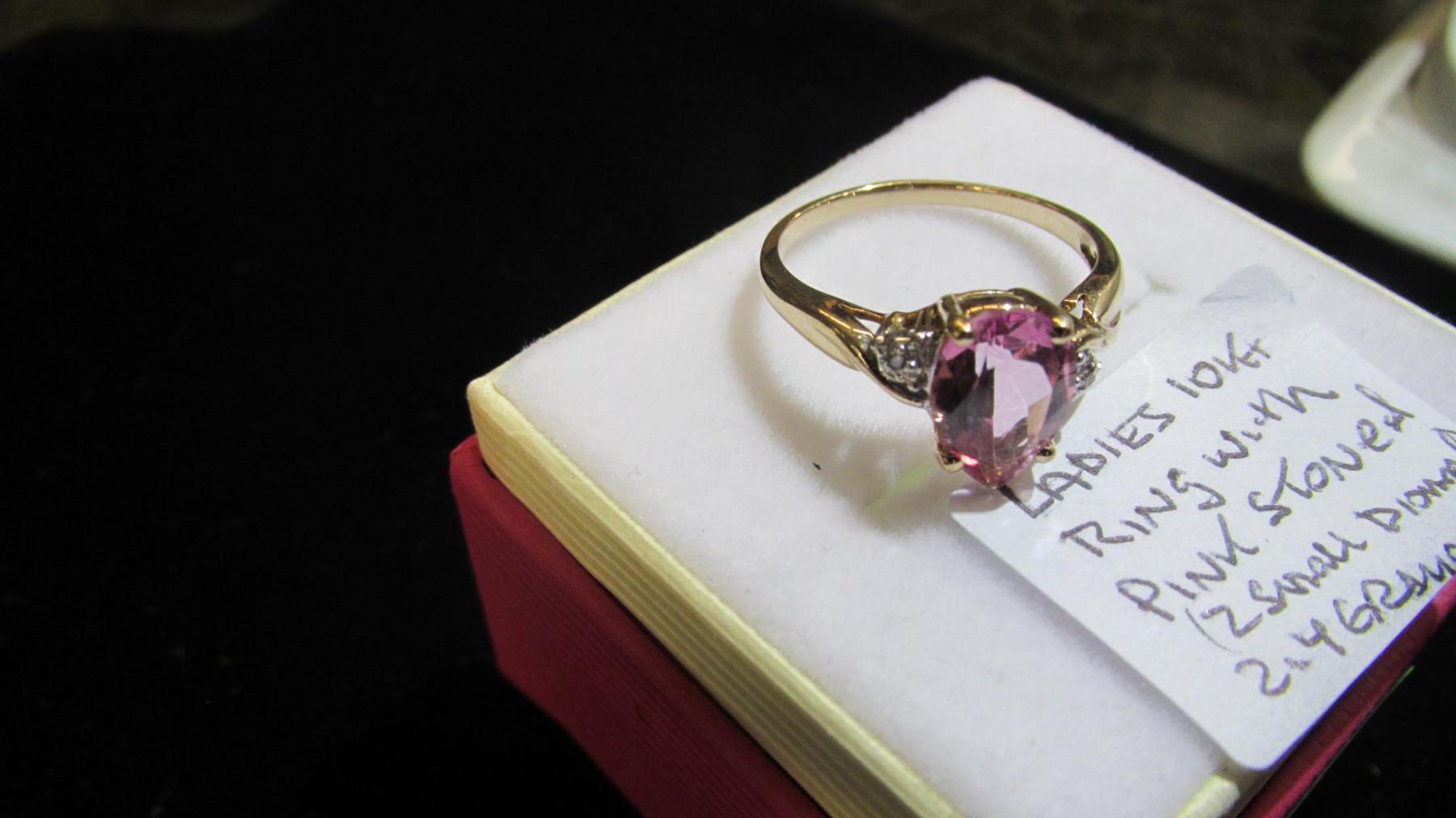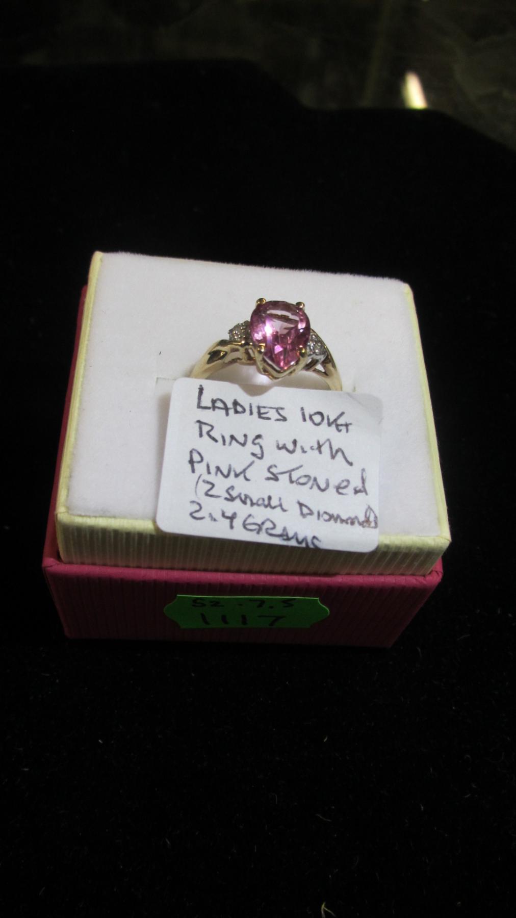 LADIES 10KT RING W/PINK STONE & 2 SMALL DIAMONDS, 2.4G, SZ 7.5