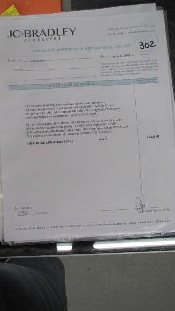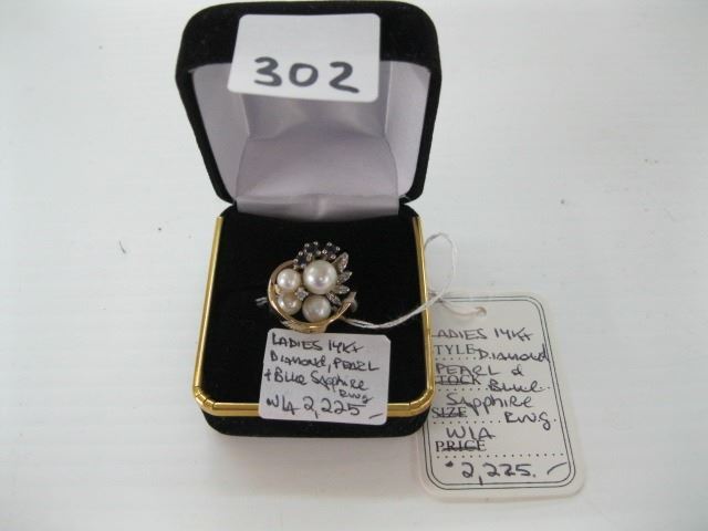 LADIES 14K DIAMOND/PEARL & BLUE SAPPHIRE RING WITH LOCAL APPRAISAL $2,225.00 - sz 6 1/2 approx.