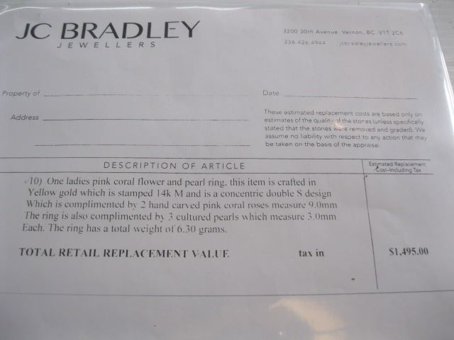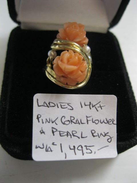 LADIES 14kt PINK CORAL FLOWER & PEARL RING W/A - $1,495.