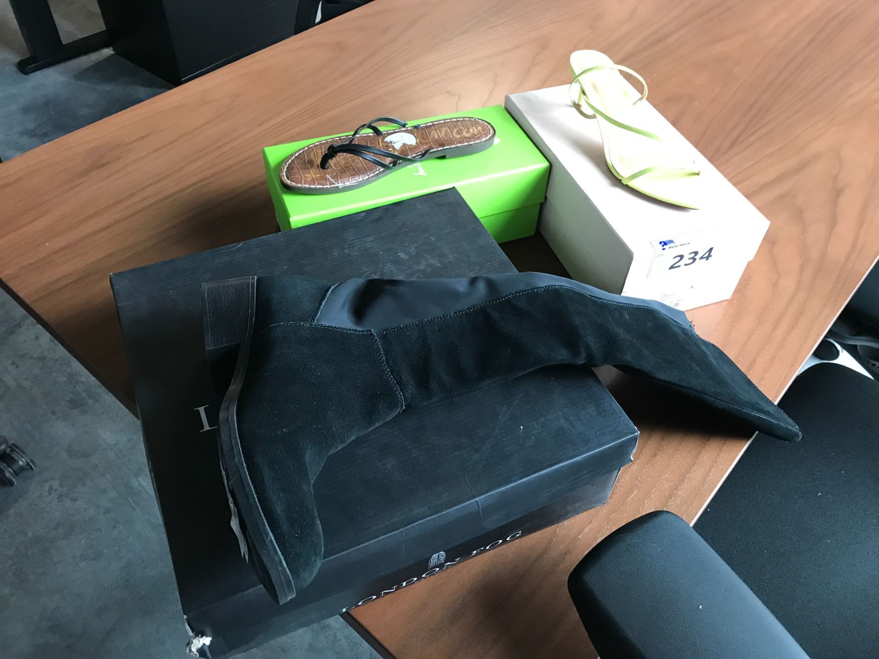 LADIES LONDON FOG BLACK SUEDE CASSIEOPIA BOOTS, ALEXANDERE BIRMAN GEEMA LIME KITTEN HEEL SHOES SIZE 7 AND SAM ELDELMAN BLACK LEATHER GERIANNE SANDALS SIZE 6.5