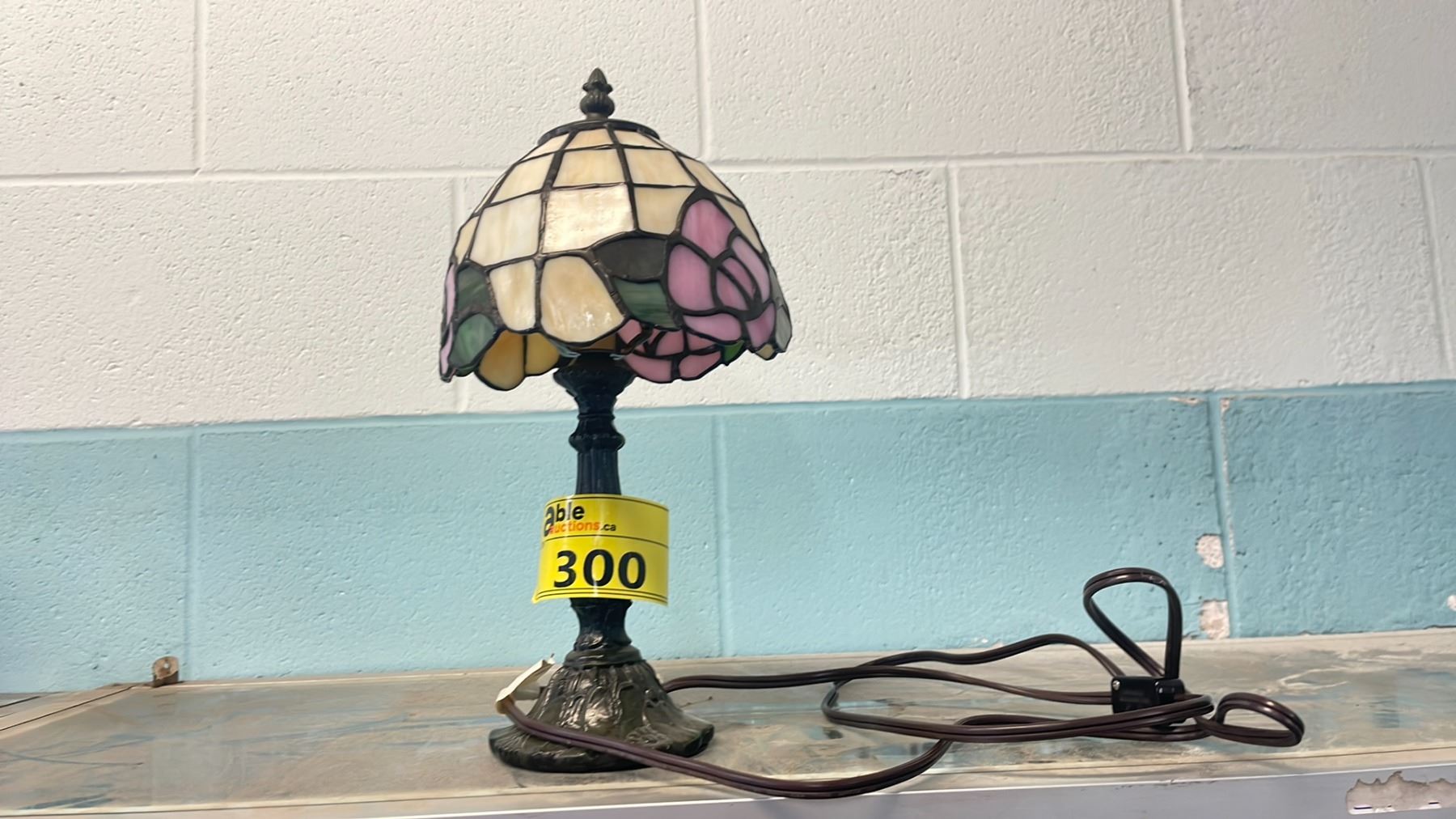 LAMP. 15" HIGH. TIFFANY STYLE SHADE.