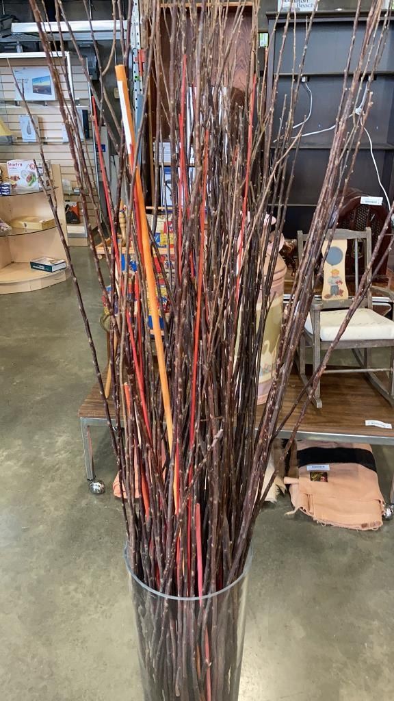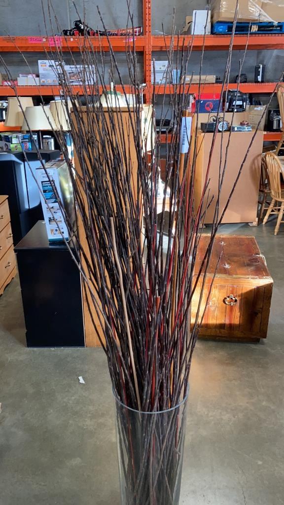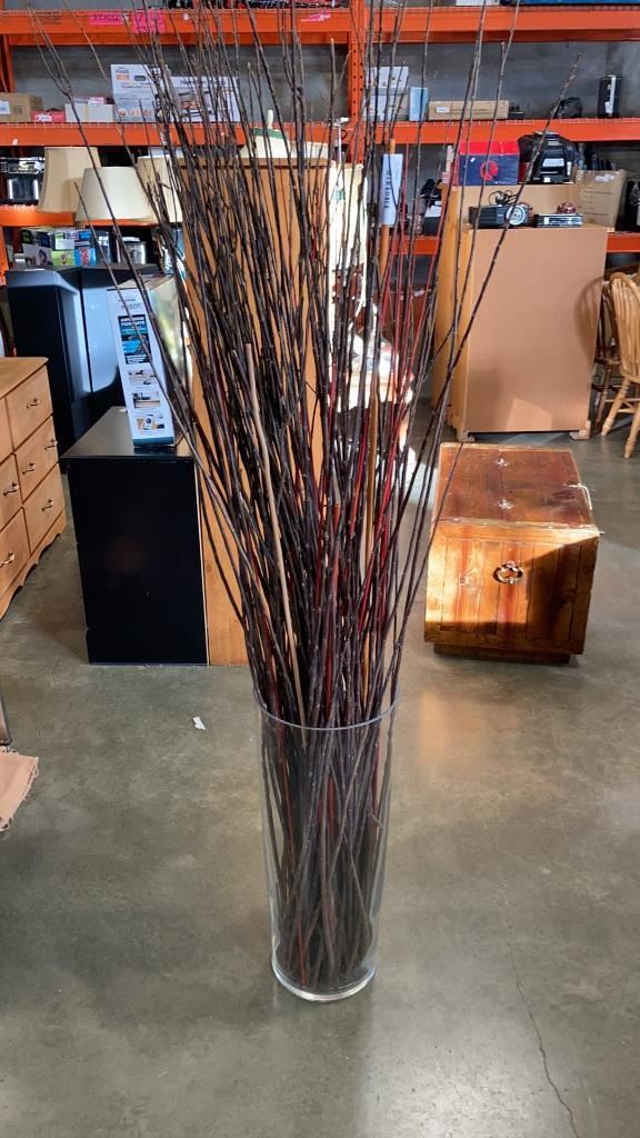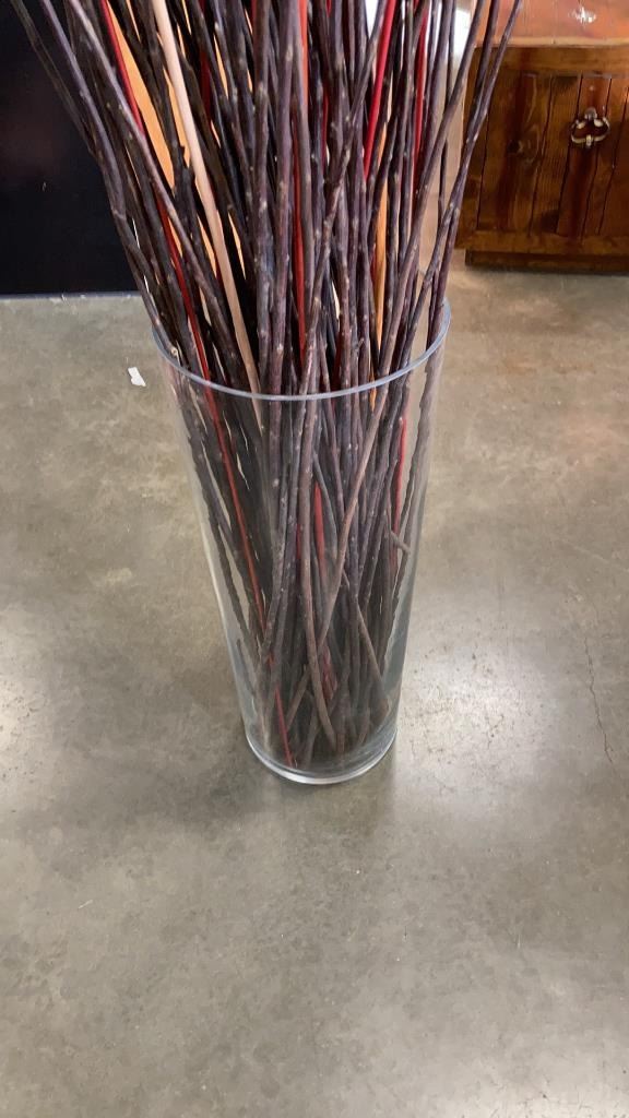 LARGE 25" TALL GLASS VASE WITH DECORATIVE STICKAGE