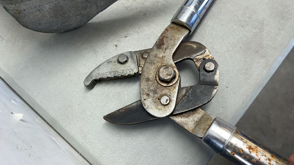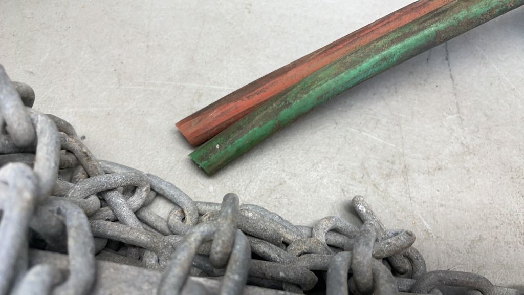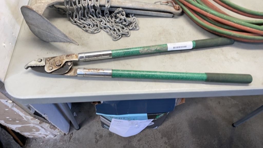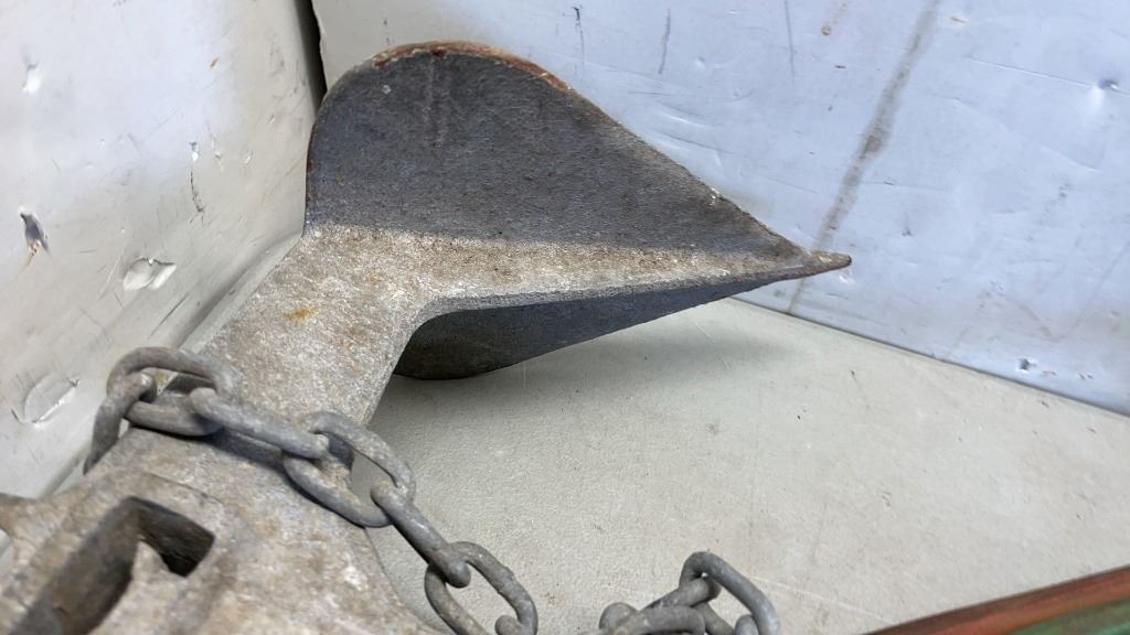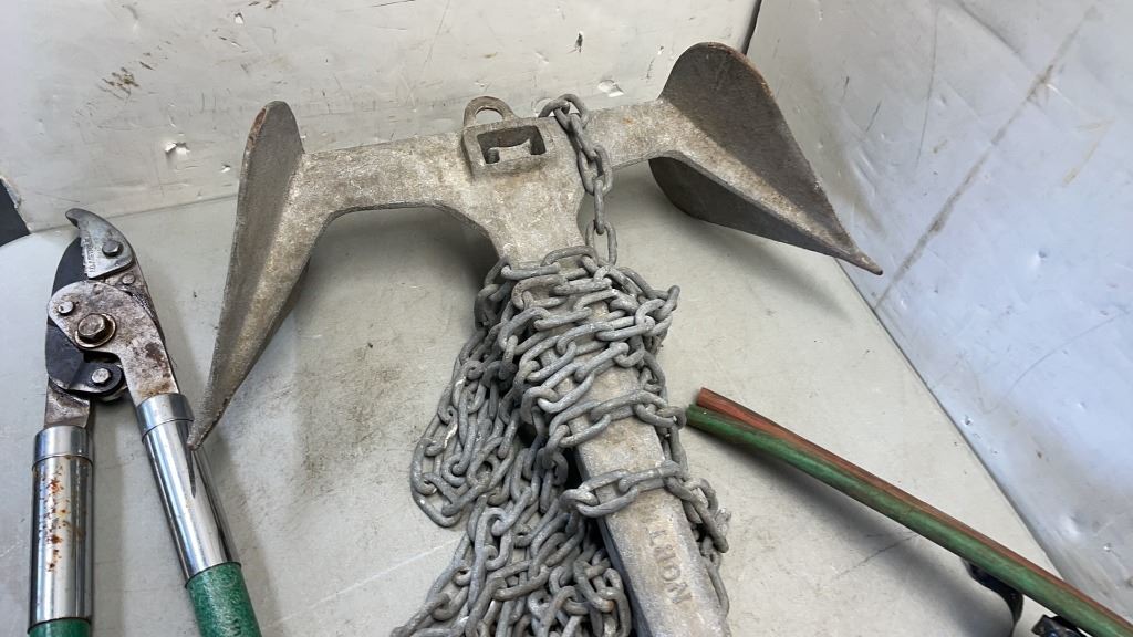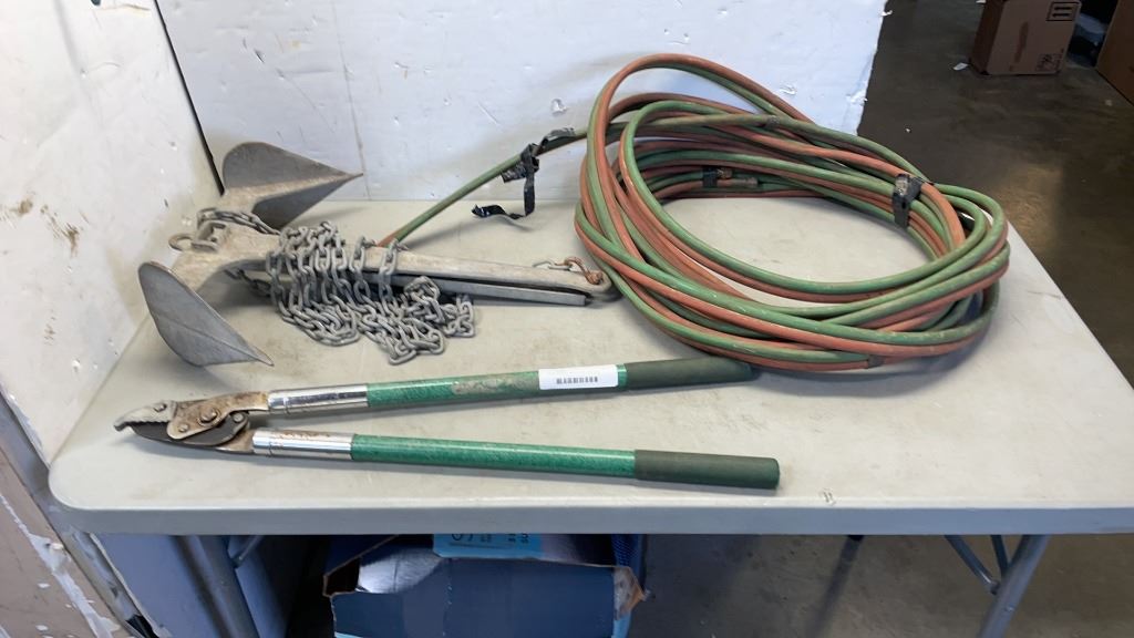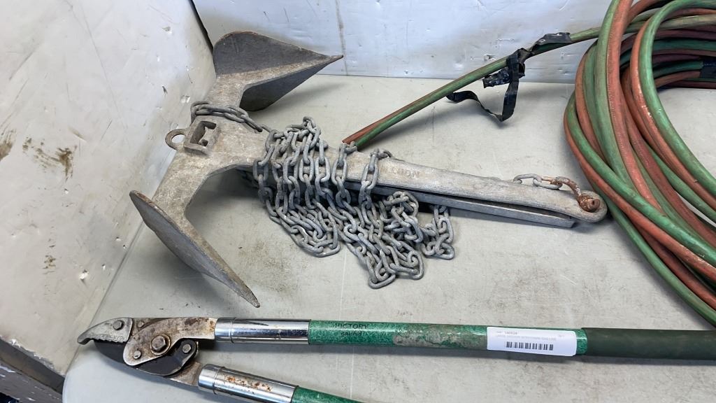 LARGE ANCHOR WITH CHAIN, GAS LINE HOSES AND PRUNER