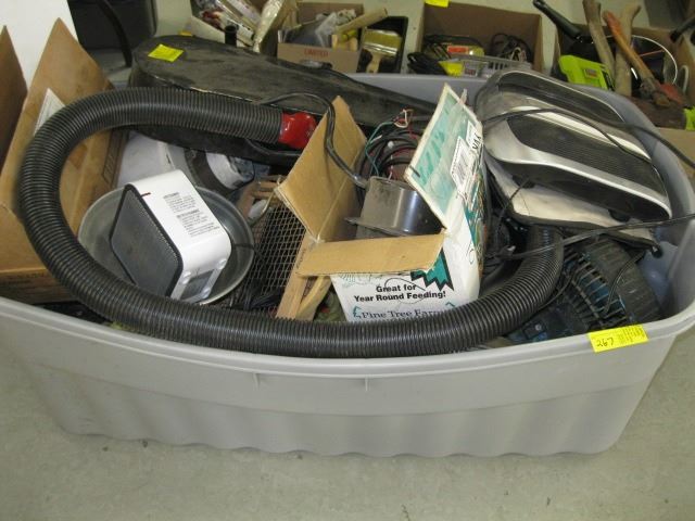 LARGE BIN OF ASSORTED FANS, HEATER, VIOLIN CASE, ROPE ETC.