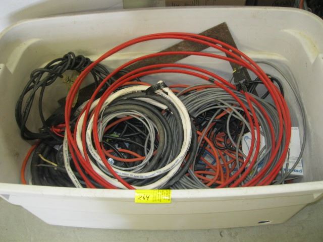 LARGE BIN OF ASSORTED WIRING, EXTENSION CORDS ETC.