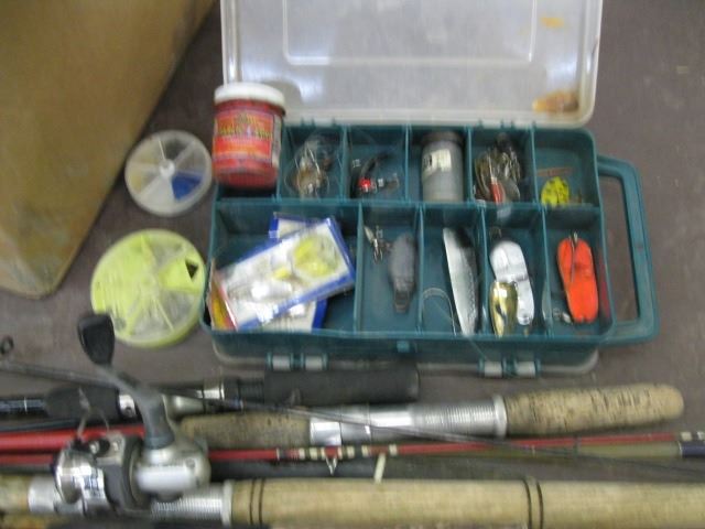 LARGE BIN OF MISC FISHING RODS & REELS, TACKLE, SMALL TENT ETC.