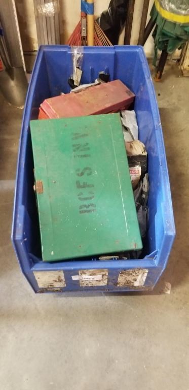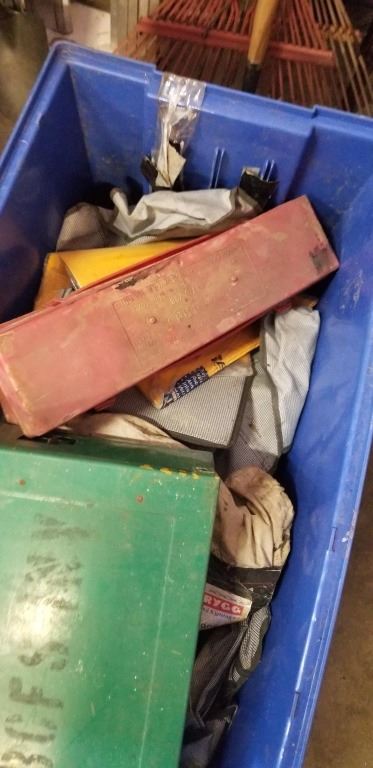 LARGE BIN WITH CURTAINS, TIRE CHAINS, CAMO STOVE, TRIANGLE FLARES AND MORE