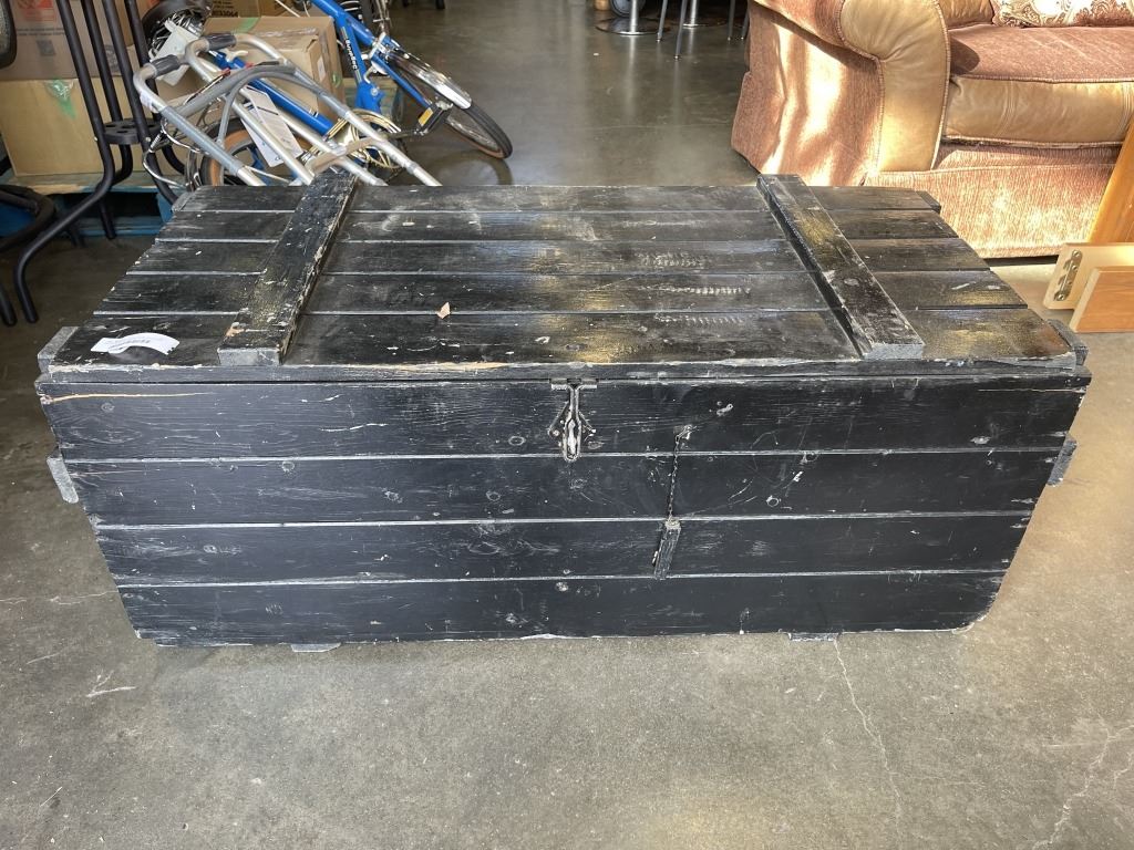 LARGE BLACK WOODEN CRATE, 4' X 2' X 20"