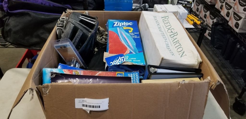 LARGE BOX OF ASSORTED HOUSEHOLD ITEMS, ZIPLOCK BAGS, BIKE HELMET AND MORE