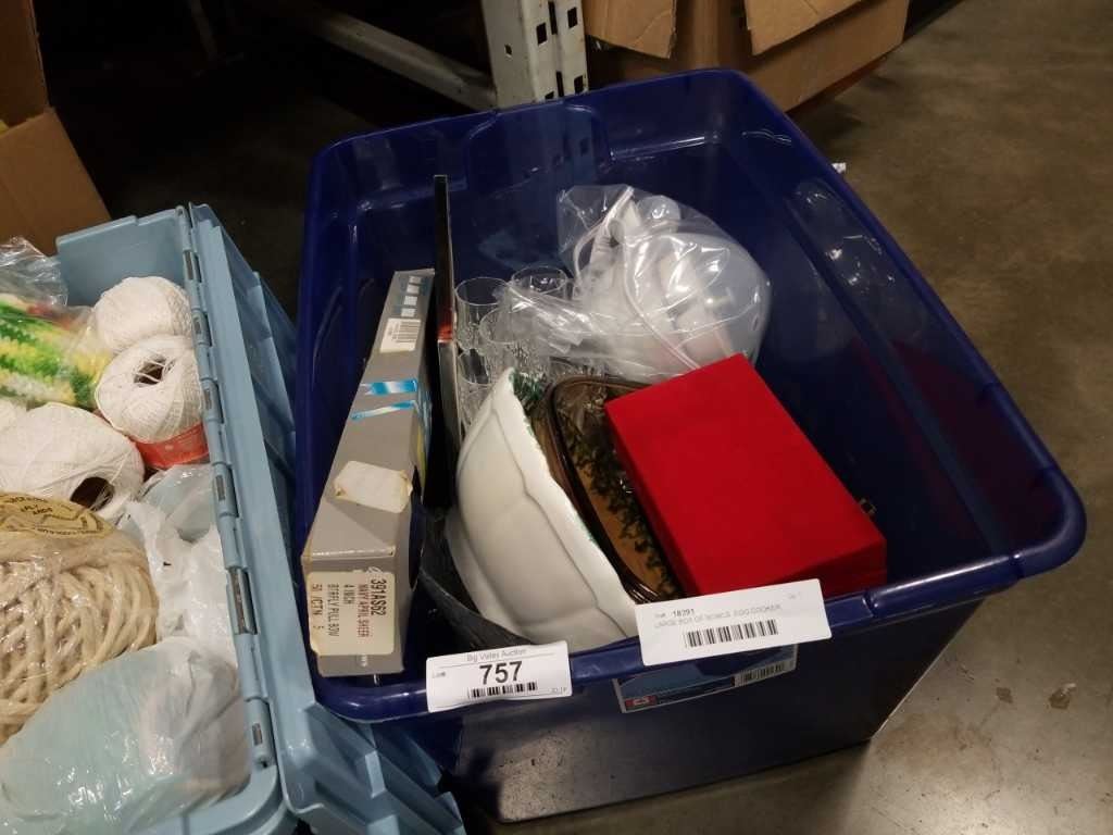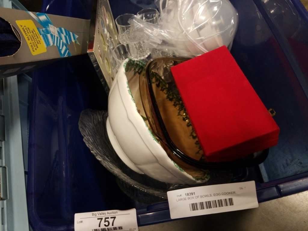 LARGE BOX OF BOWLS, EGG COOKER, WINE STEMS, RIBBON BOWS, PICTURE FRAME, AND SILVER-PLATE CONDIMENT S